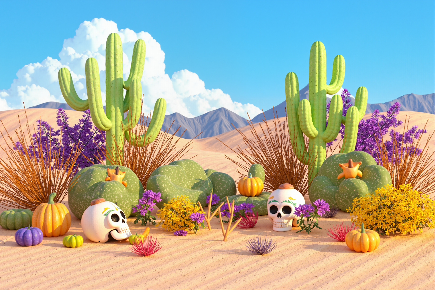 Bright desert scene with cacti, colorful flowers, pumpkins, and festive painted skulls under a sunny blue sky. Vibrant and cheerful.