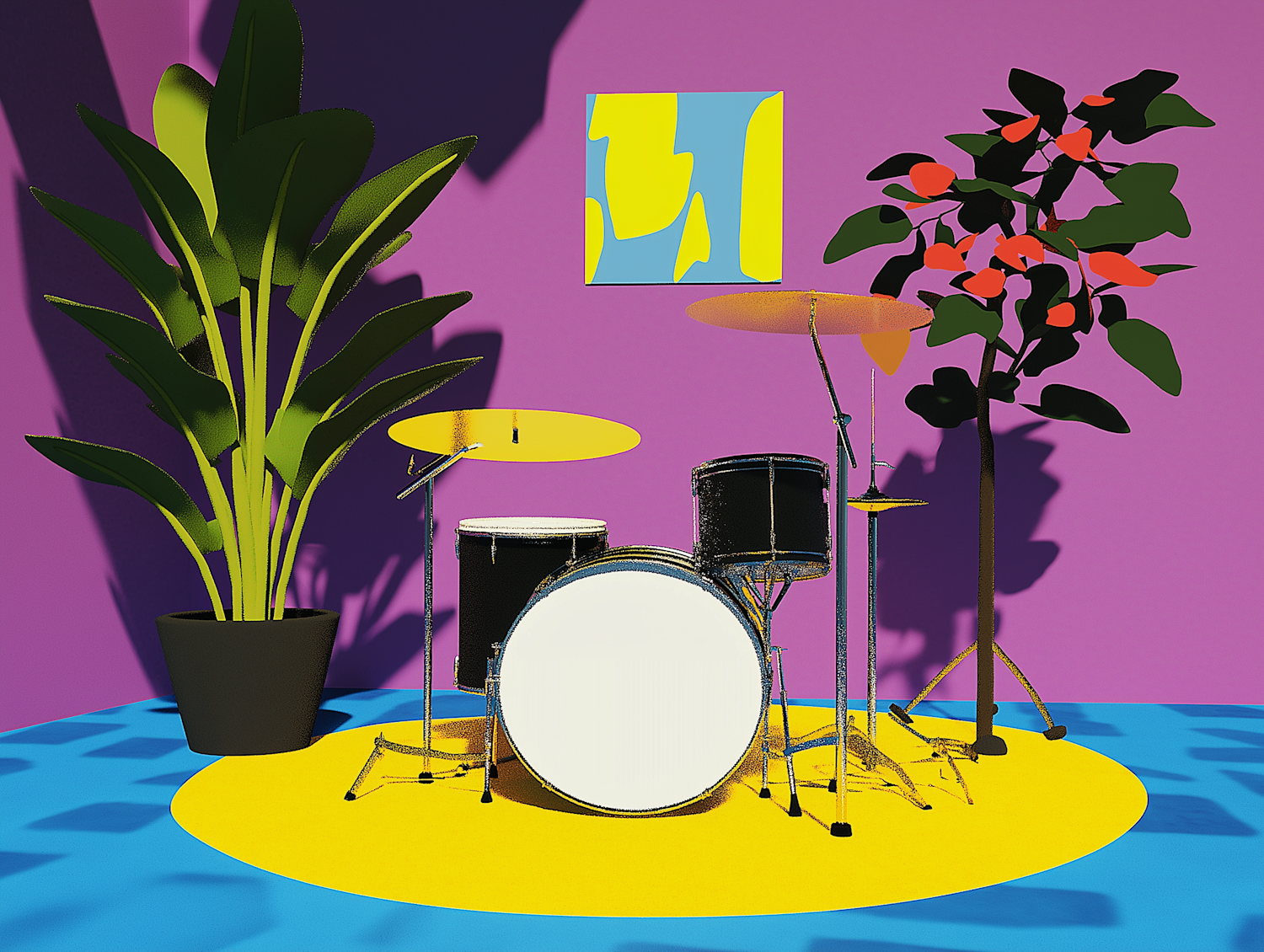 Colorful room with a drum set, vibrant plants, and abstract art on a purple wall. Bright yellow rug and blue floor add to the lively scene.