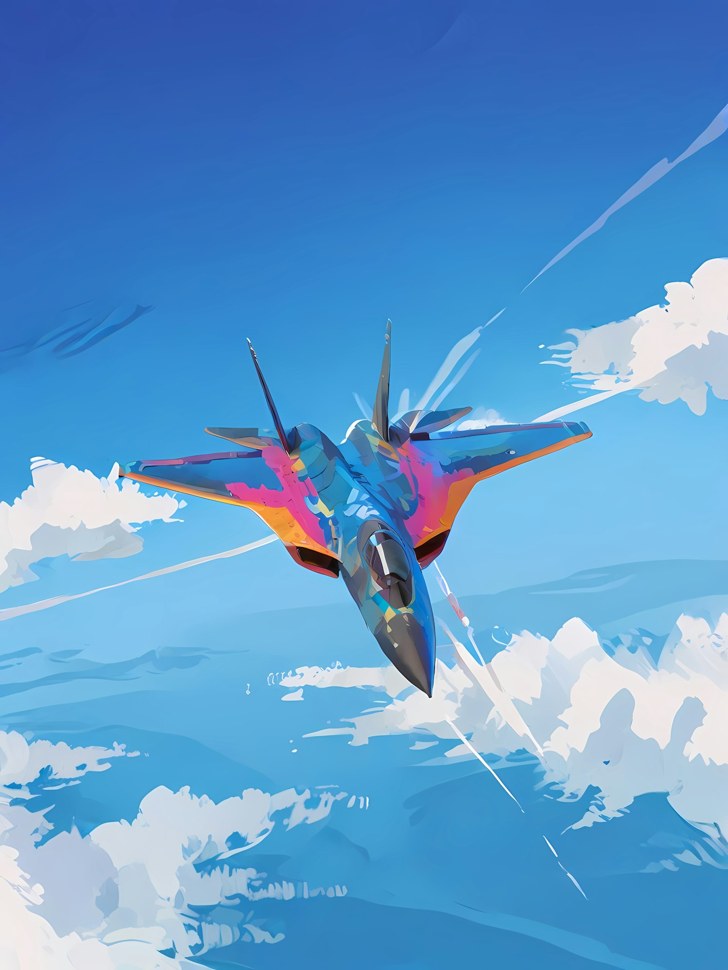 A colorful fighter jet with a multicolored design soars through a bright blue sky, leaving contrails behind. Dynamic and vibrant illustration.