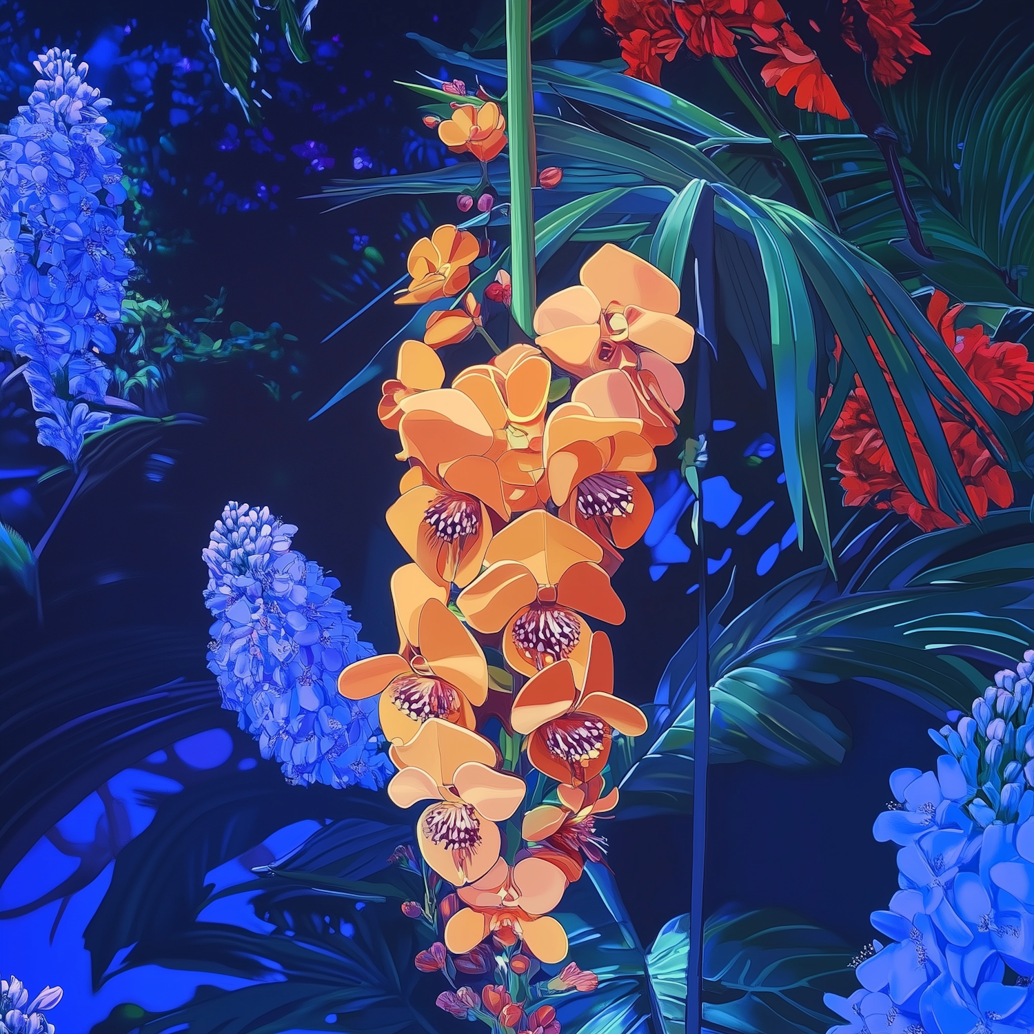 Vibrant illustration of orange orchids with lush green leaves and contrasting blue and red flowers in a tropical garden setting.