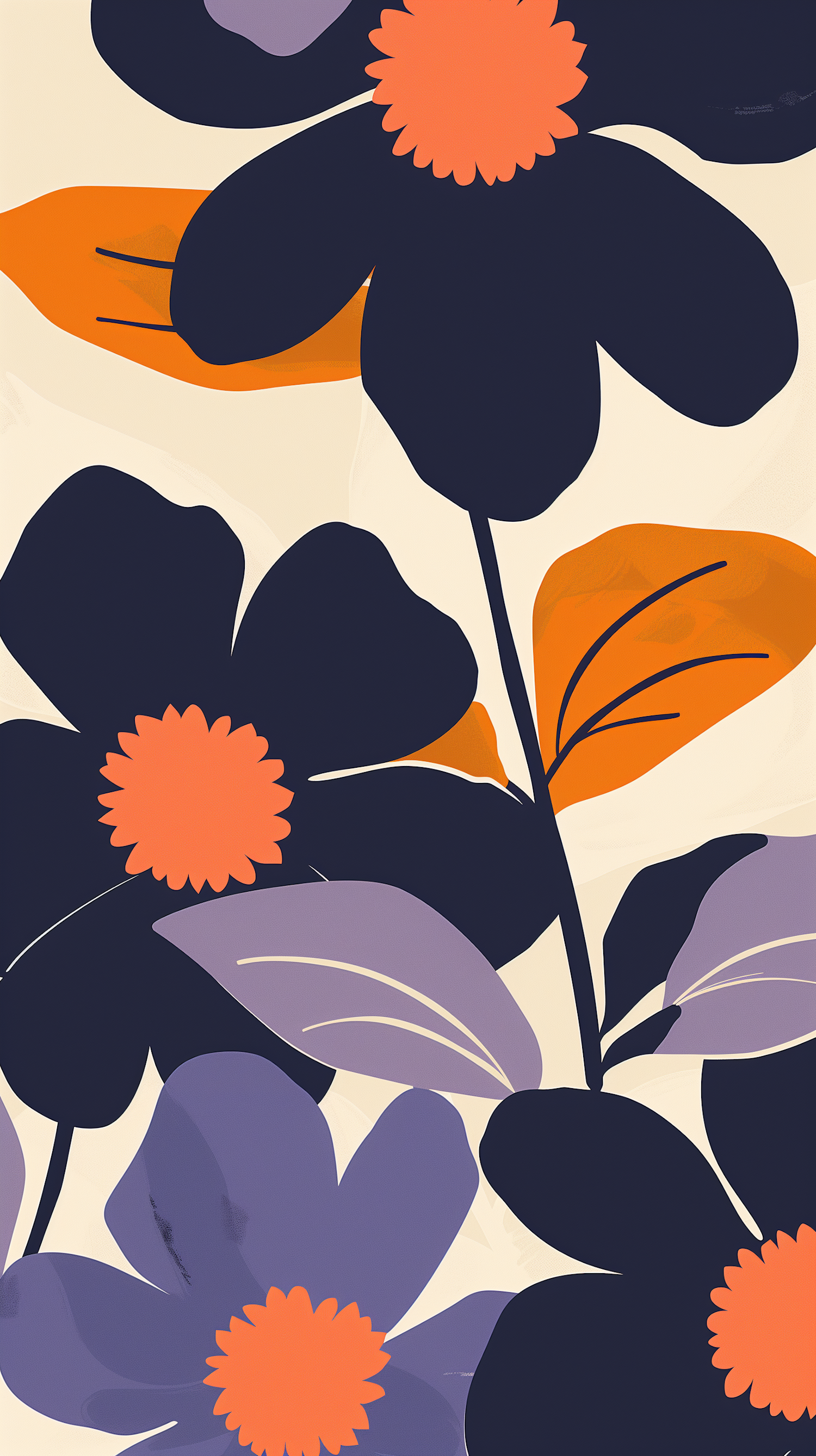 Bold floral illustration with navy petals, orange centers, and lavender leaves on a beige background. Perfect for modern decor or design.