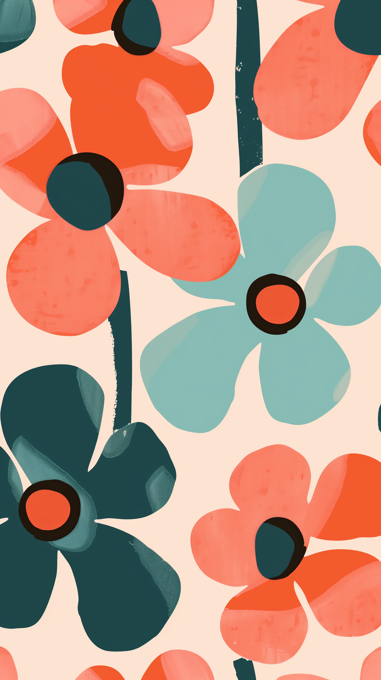 Bright abstract floral design with coral, teal, and green flowers on a beige background. Modern, painterly style with bold, textured petals.