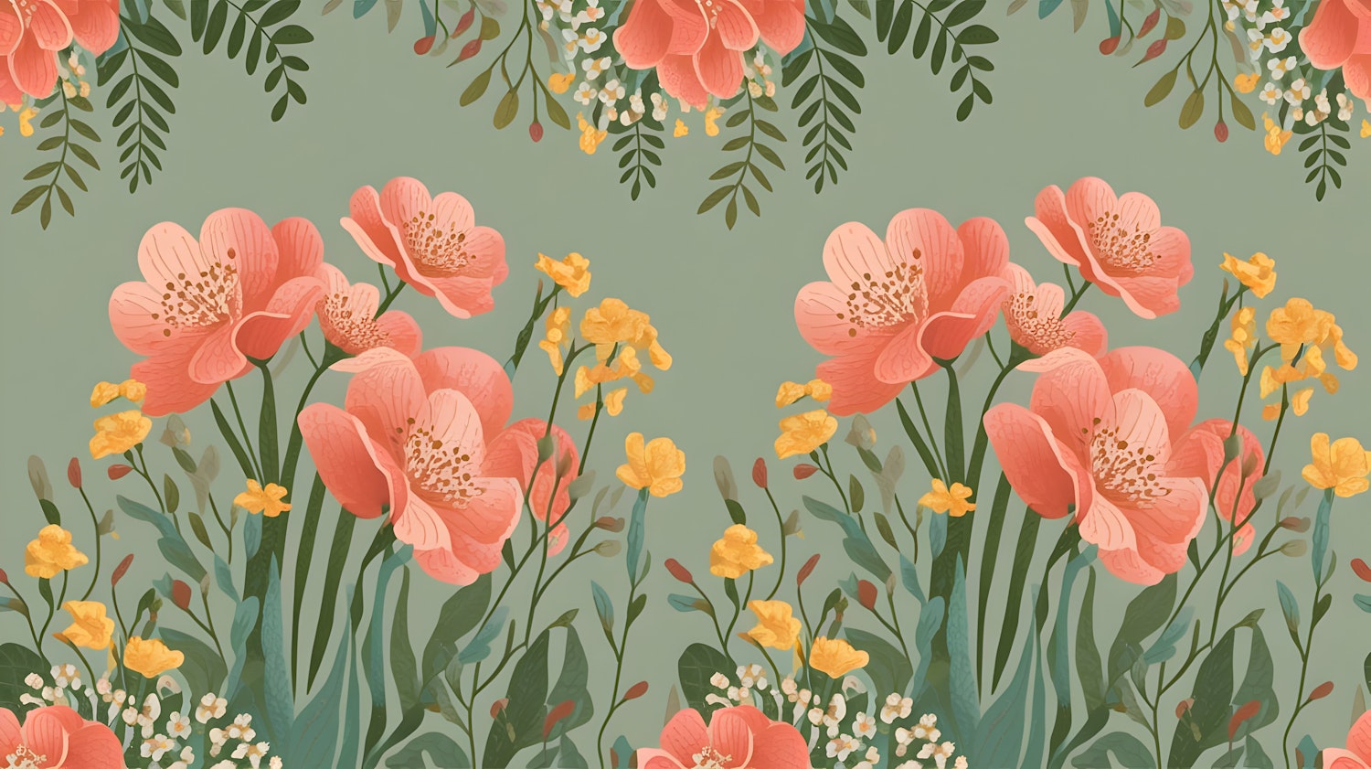 Beautiful floral illustration with coral pink and yellow flowers on a muted green background, perfect for spring-inspired designs.