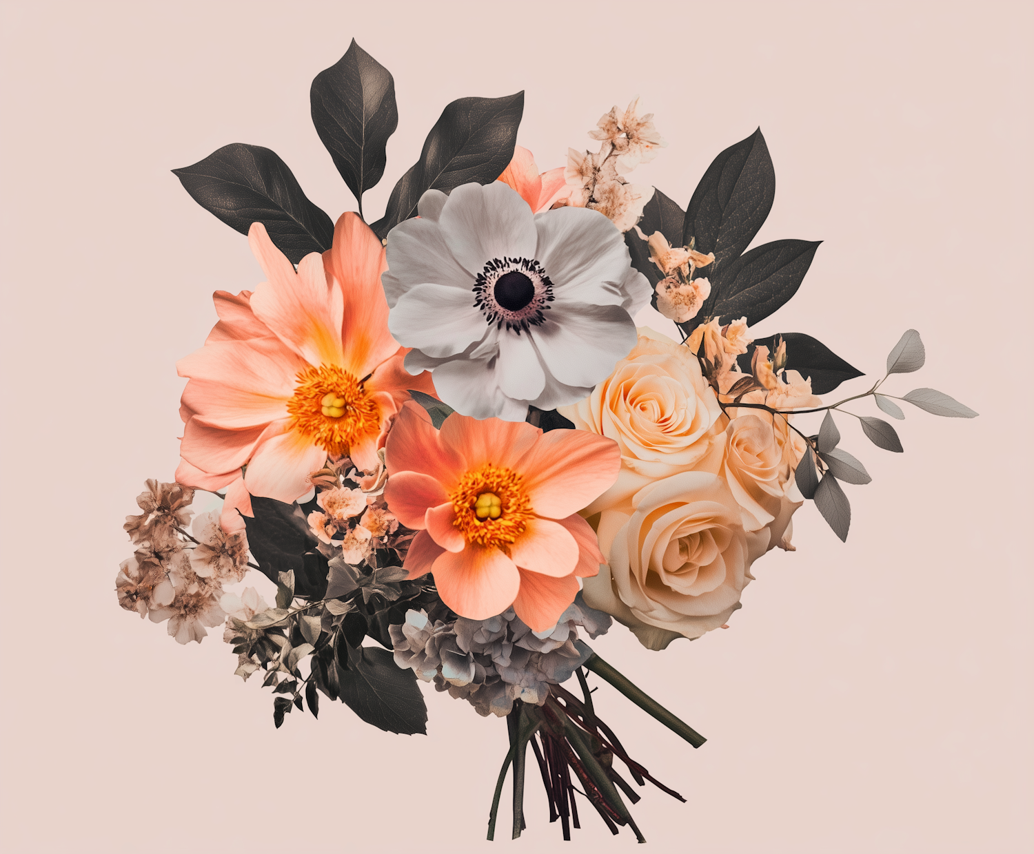 Elegant bouquet with peach flowers, white roses, and anemone against a beige background, showcasing floral artistry and natural beauty.