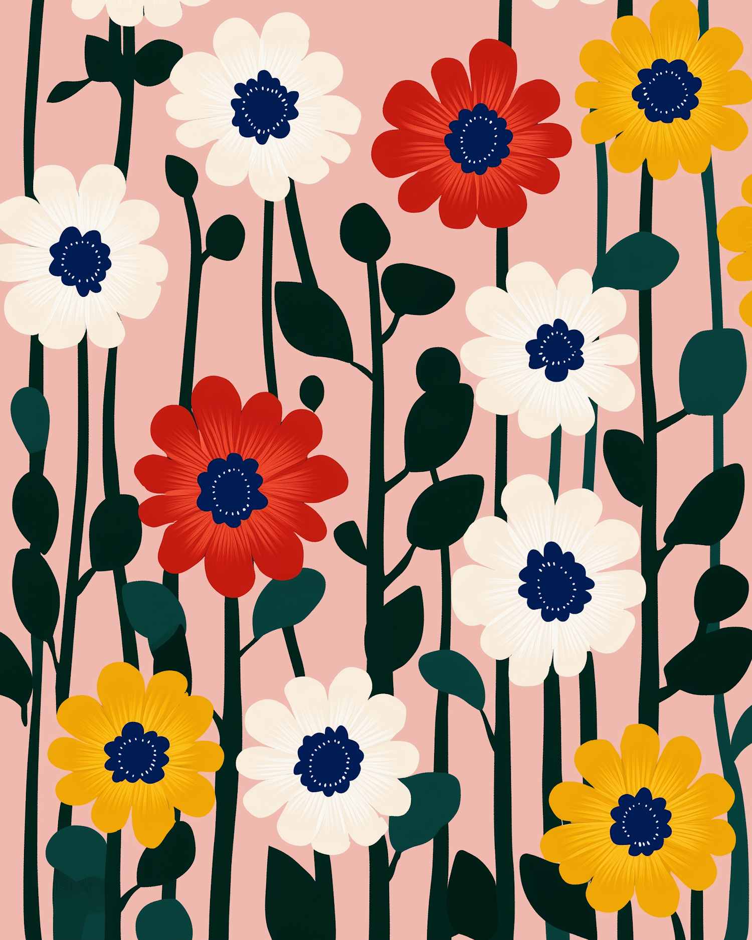 Colorful floral illustration with red, white, and yellow flowers on a pink background. Bold and modern design with dark green leaves.