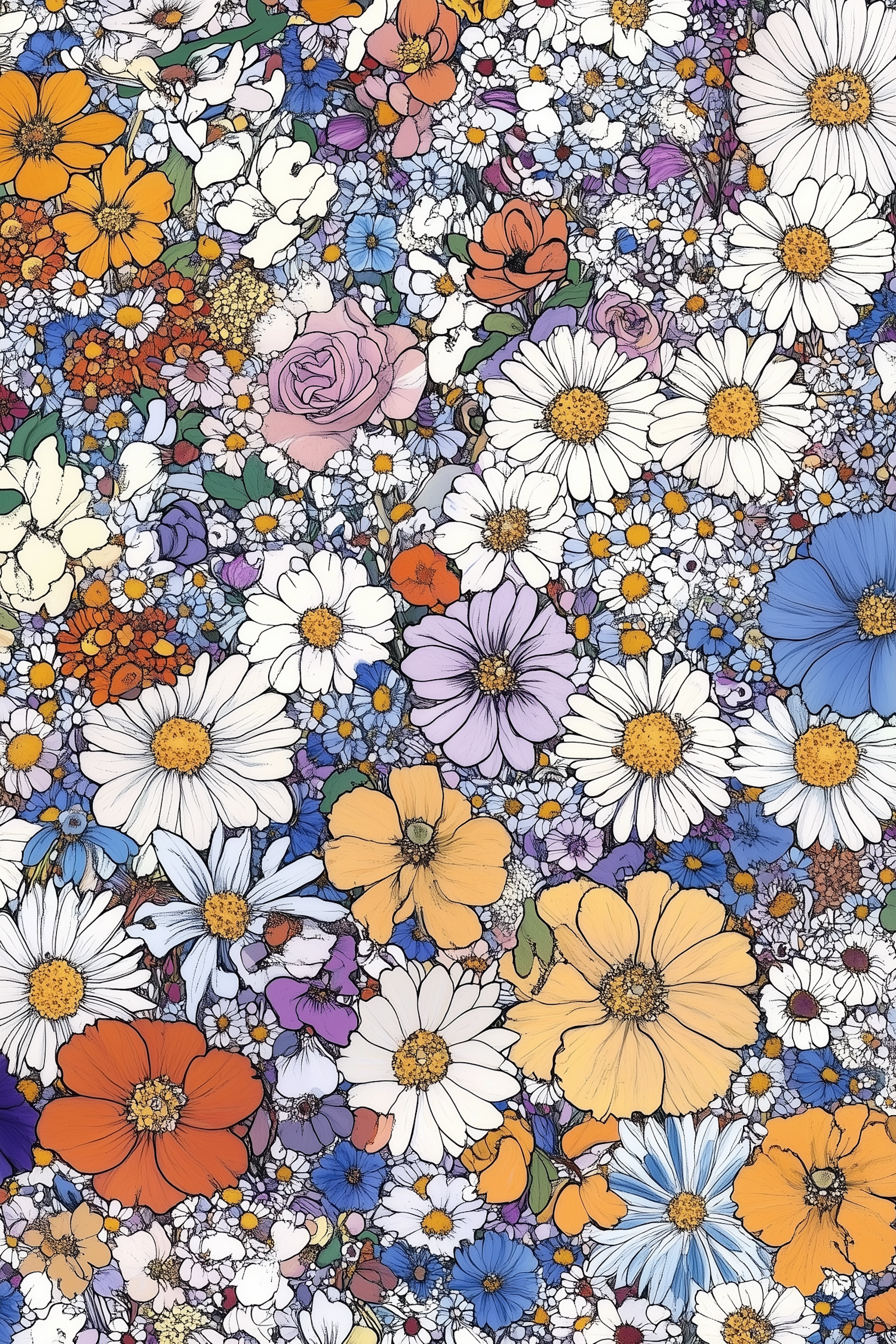 Colorful floral illustration with daisies, roses, and various blossoms in vibrant hues, creating a rich tapestry of nature's beauty.