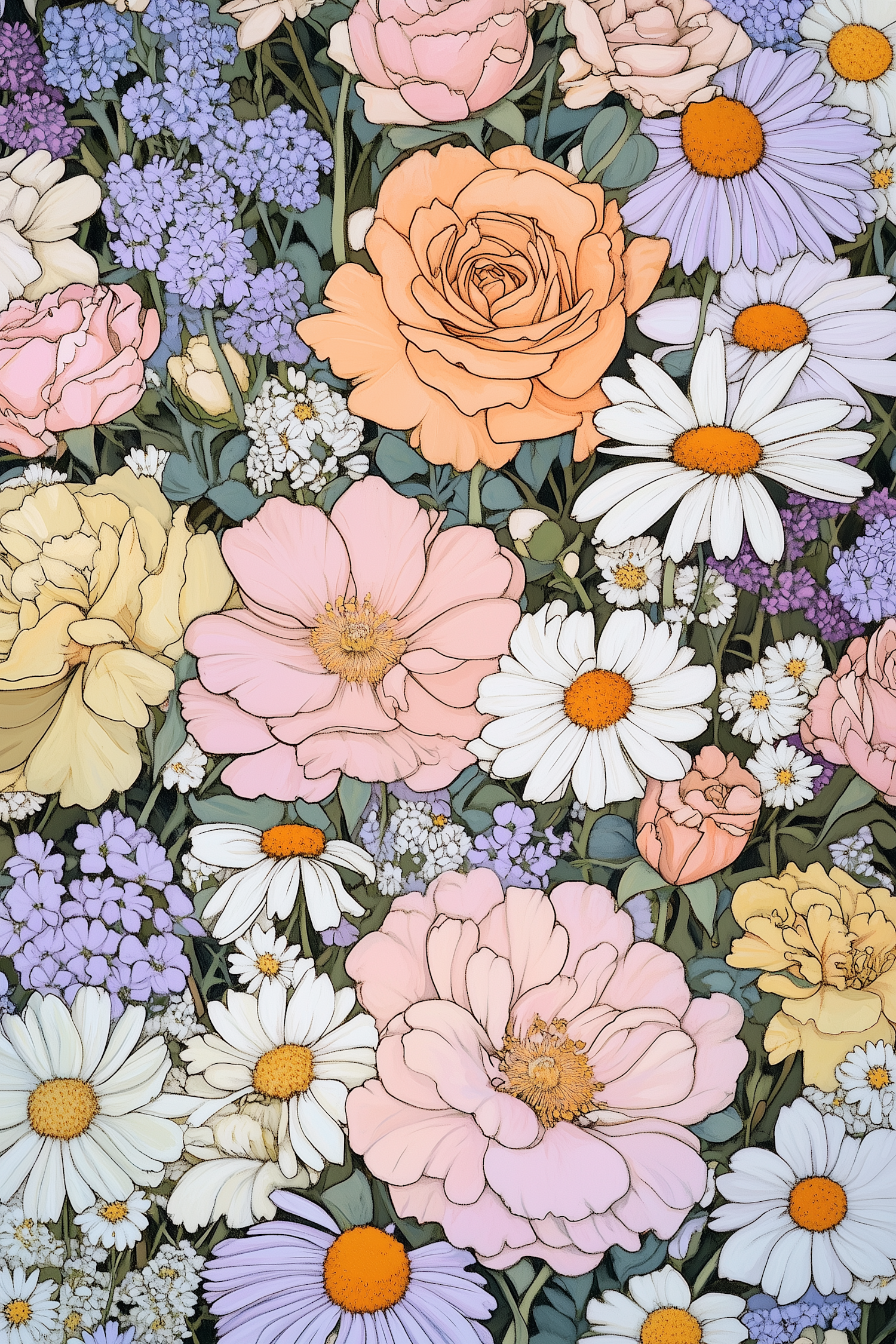 Vibrant floral illustration with roses, daisies, and lush greenery in soft pinks, oranges, and purples. A lively garden scene.