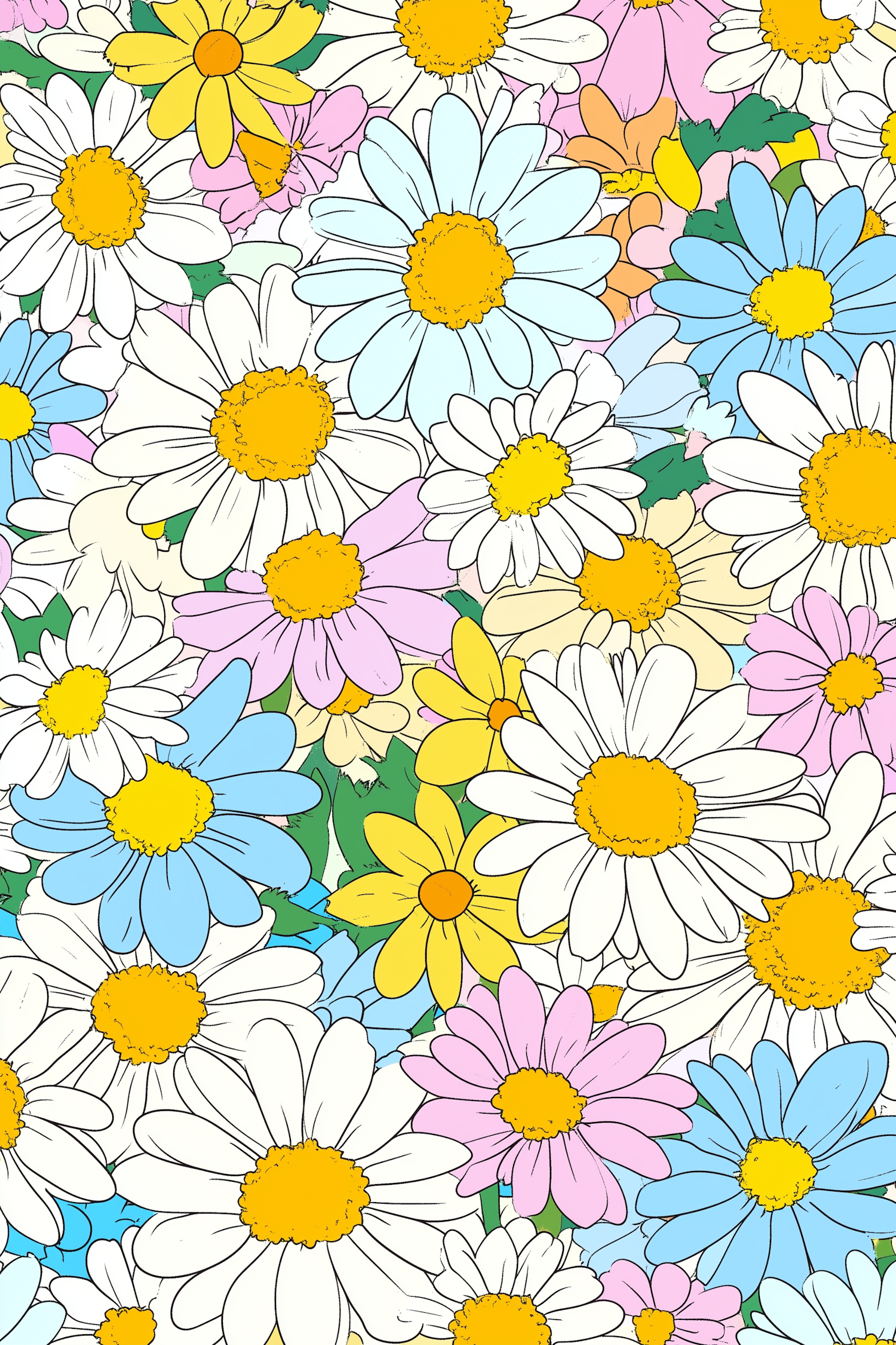 Colorful daisy illustration with vibrant petals in white, blue, pink, and yellow, creating a lively and cheerful floral pattern.
