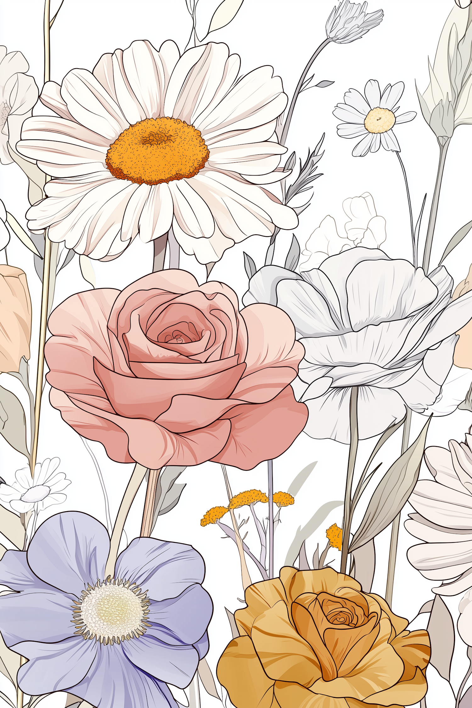 Colorful floral illustration with pink roses, white daisies, and blue flowers. A harmonious blend of vibrant and soft hues.