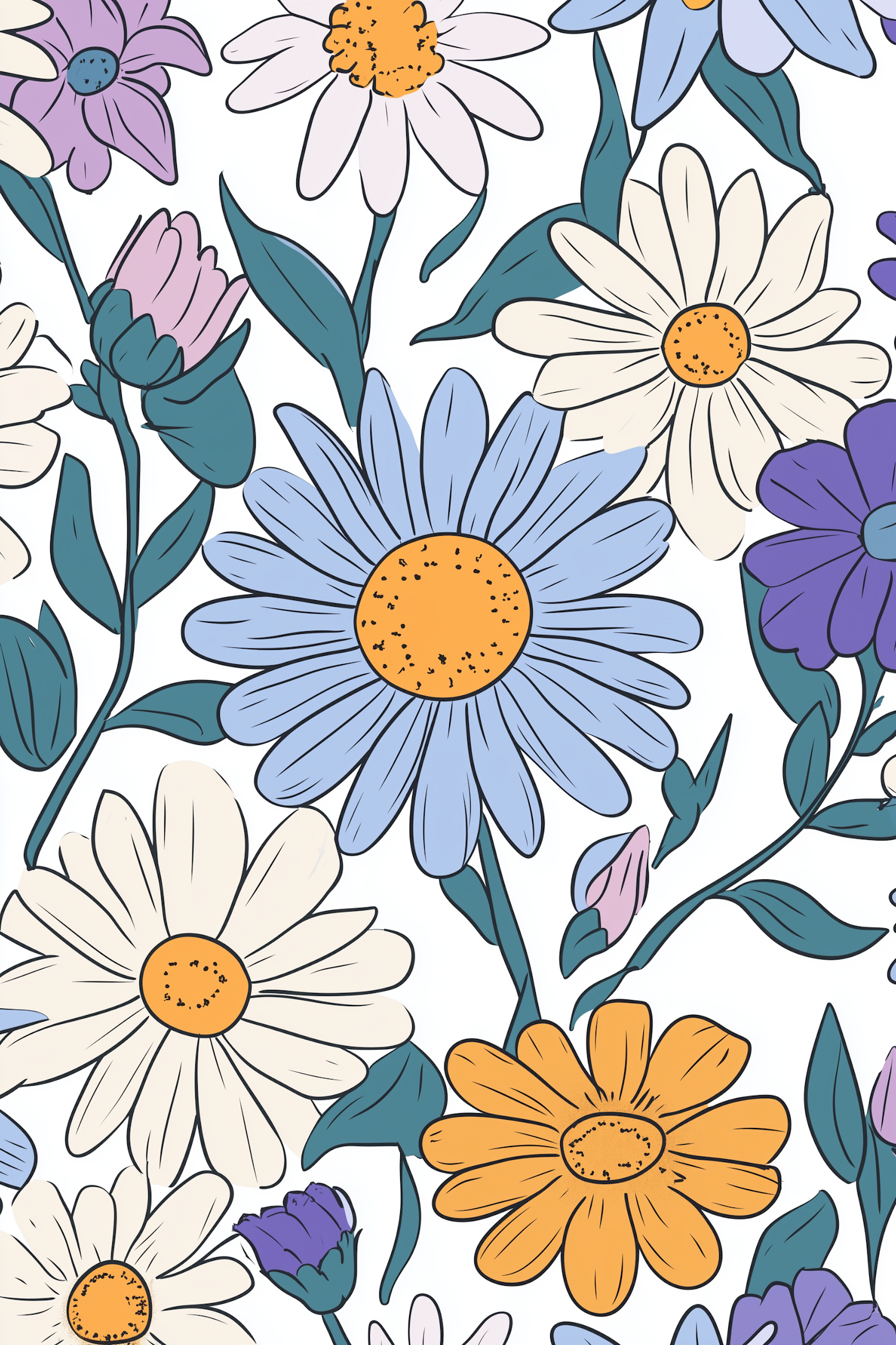 Colorful floral illustration with daisies and other flowers in pastel shades, bold outlines, and green leaves on a white background.