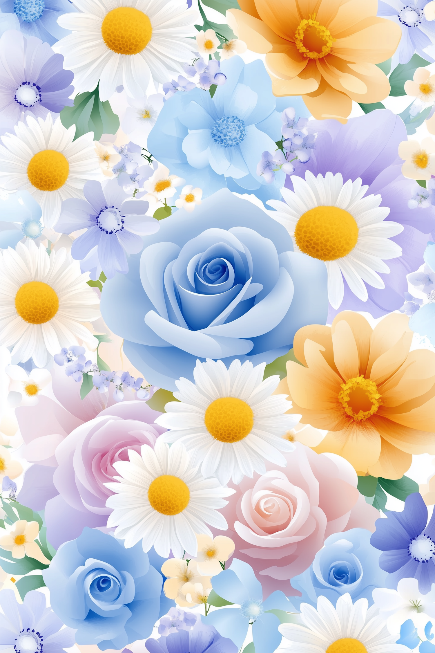 Colorful floral illustration with blue roses, white daisies, and orange flowers, creating a vibrant and harmonious composition.