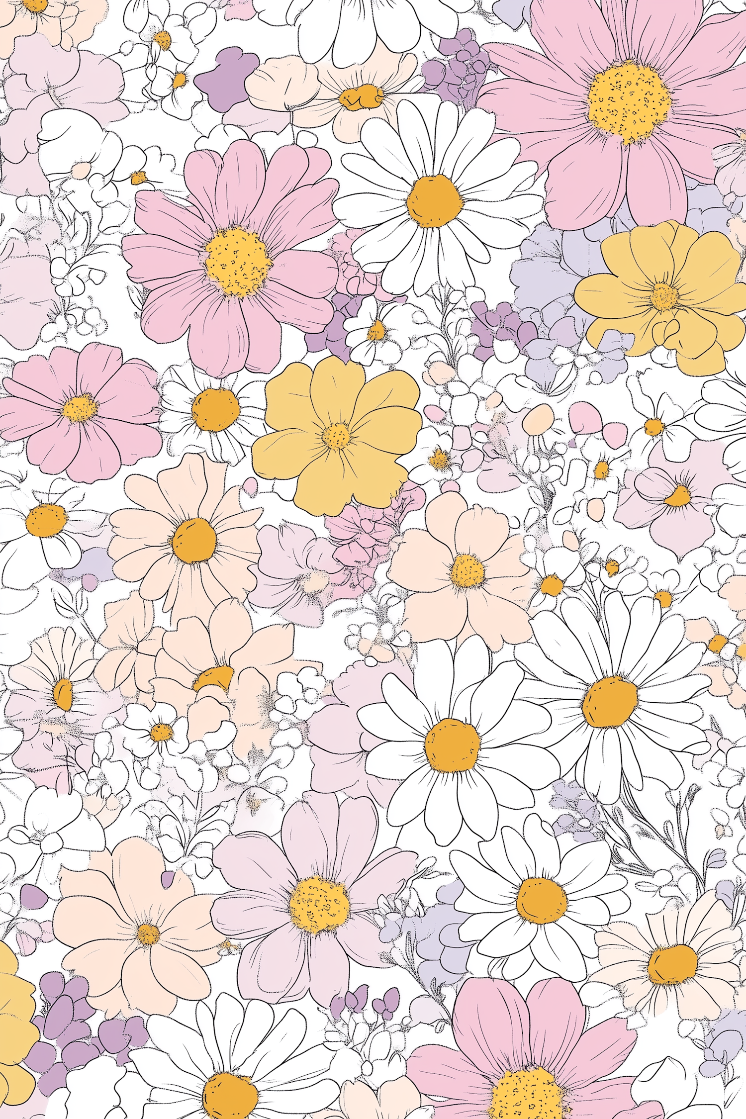 Colorful floral pattern with pink, yellow, and white flowers on a white background, creating a lively and cheerful design.