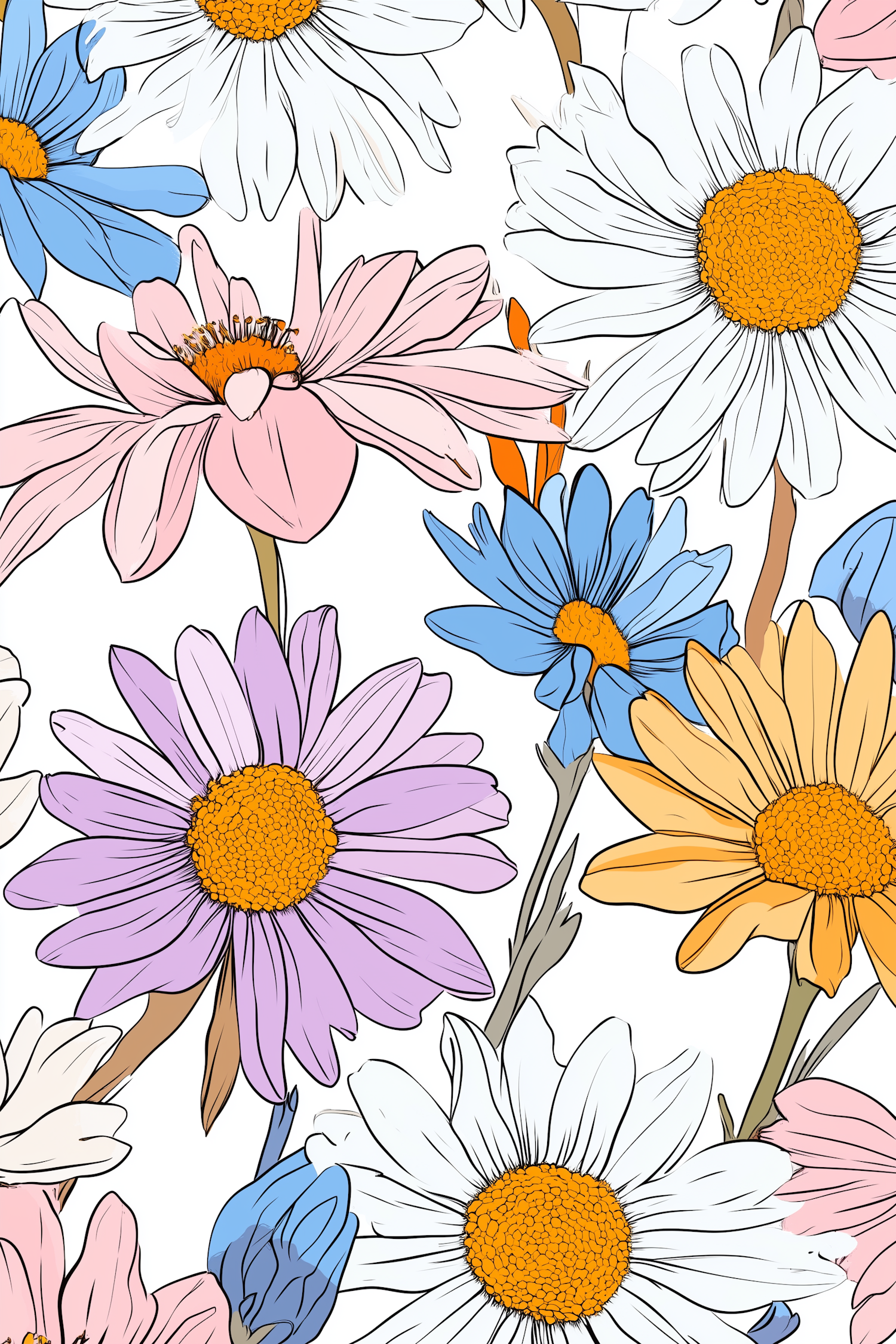 Colorful floral illustration with pink, purple, blue, yellow, and white flowers on a white background. Vibrant and detailed design.