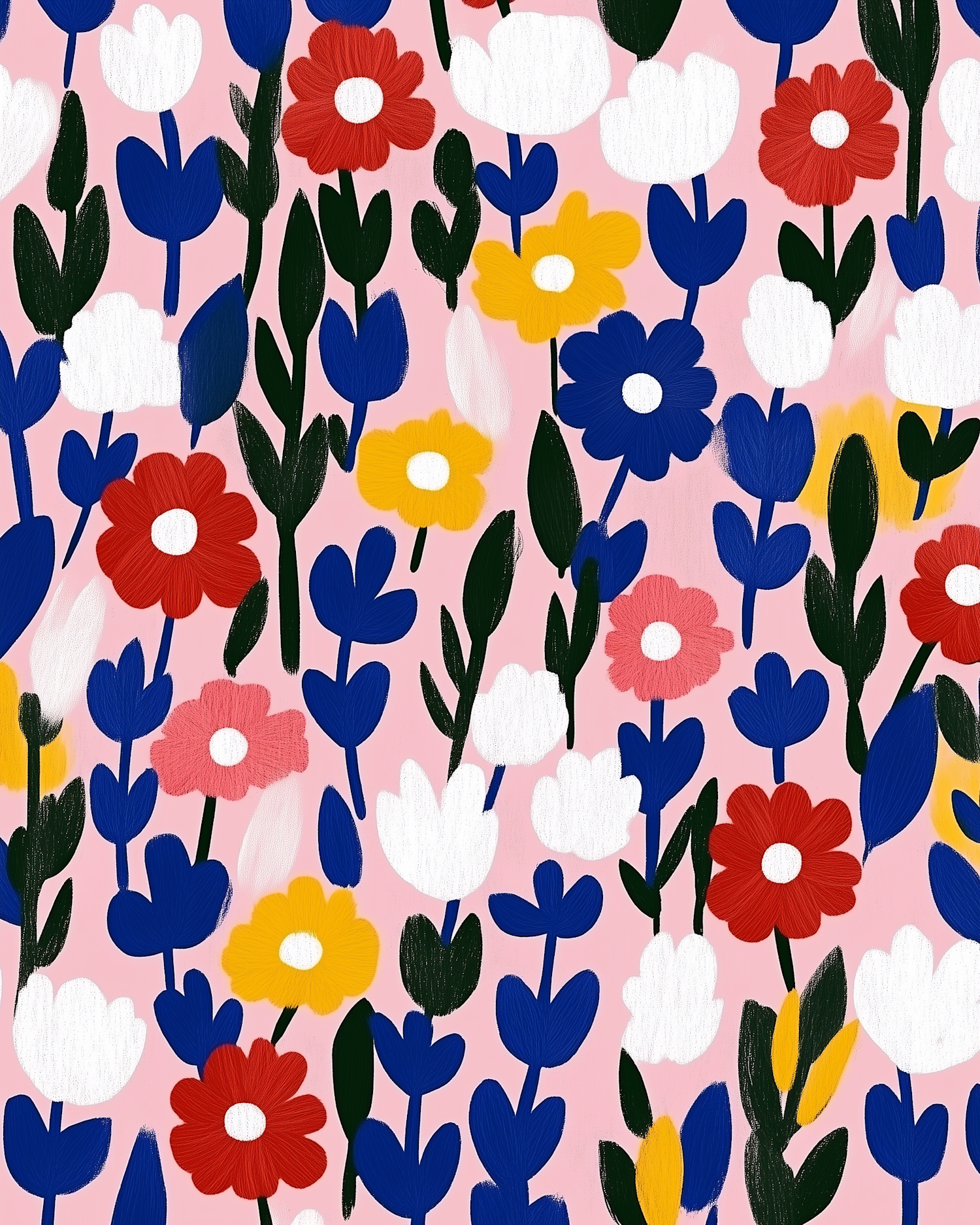 Colorful floral pattern with red, blue, yellow, and white flowers on a pink background, featuring green leaves and stems.