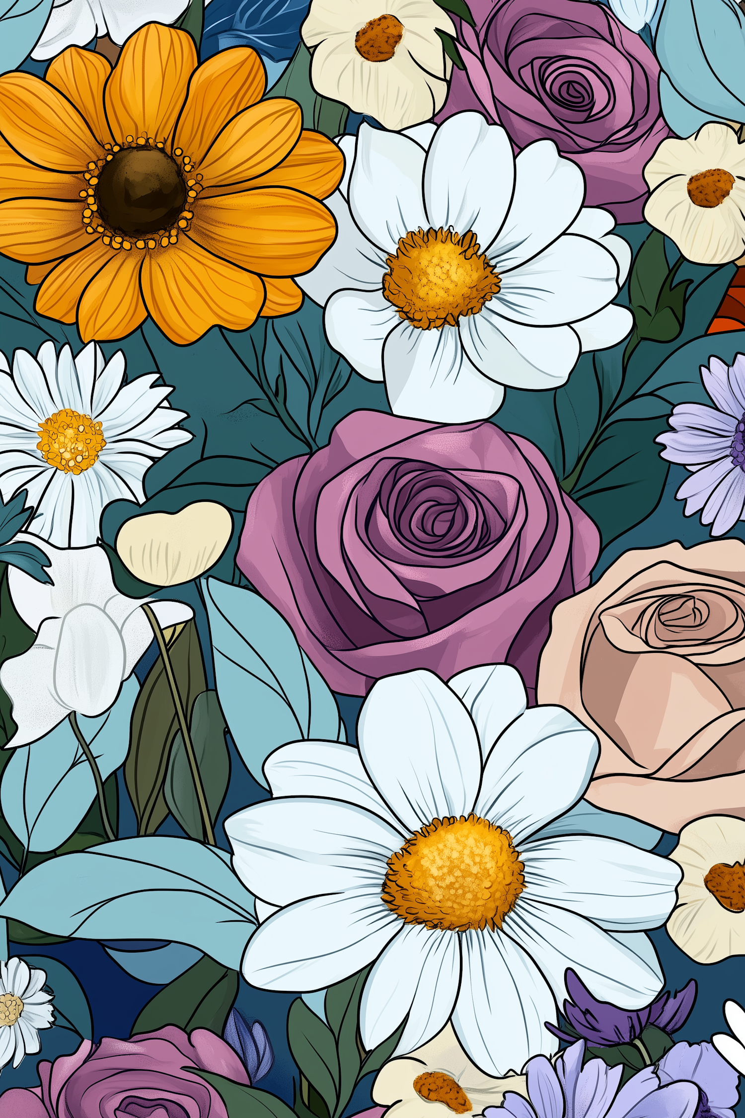 Colorful floral illustration with white, yellow, and purple flowers, featuring lush green leaves and intricate petal designs.