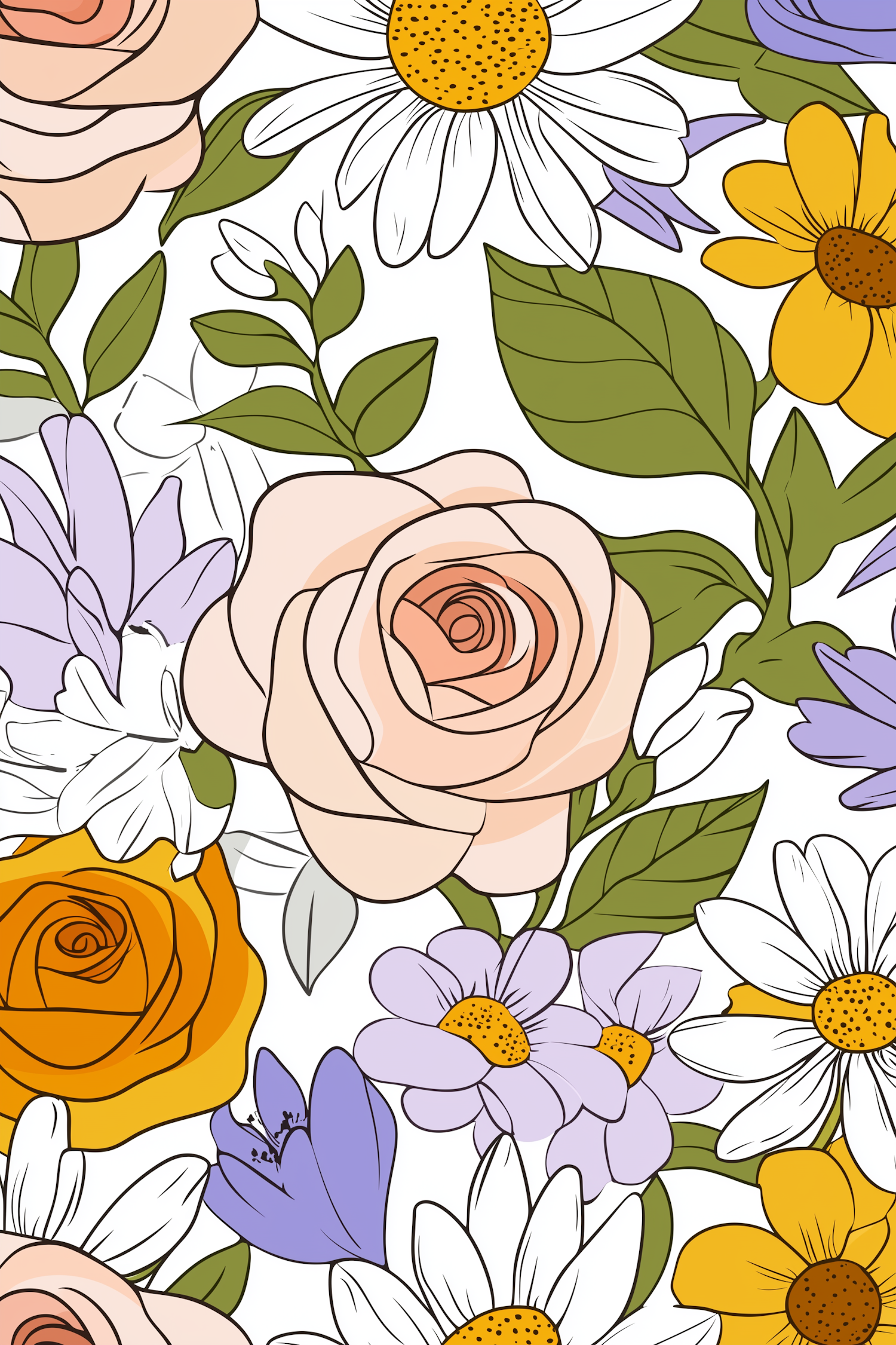 Colorful floral illustration with roses, daisies, and purple flowers on a white background, showcasing vibrant hues and intricate details.