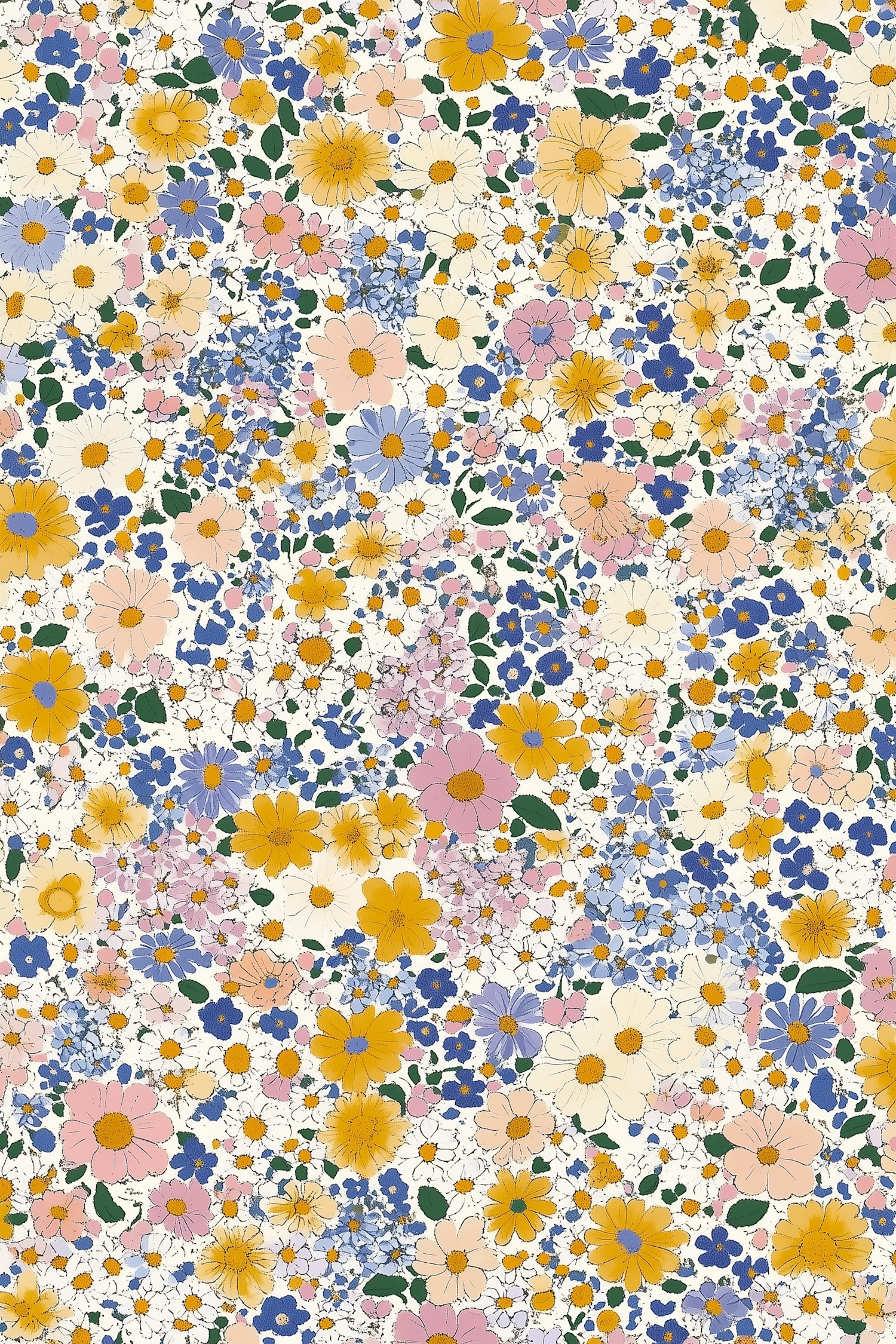 Bright floral pattern with yellow, pink, blue, and white flowers on an off-white background, perfect for textiles or decor.