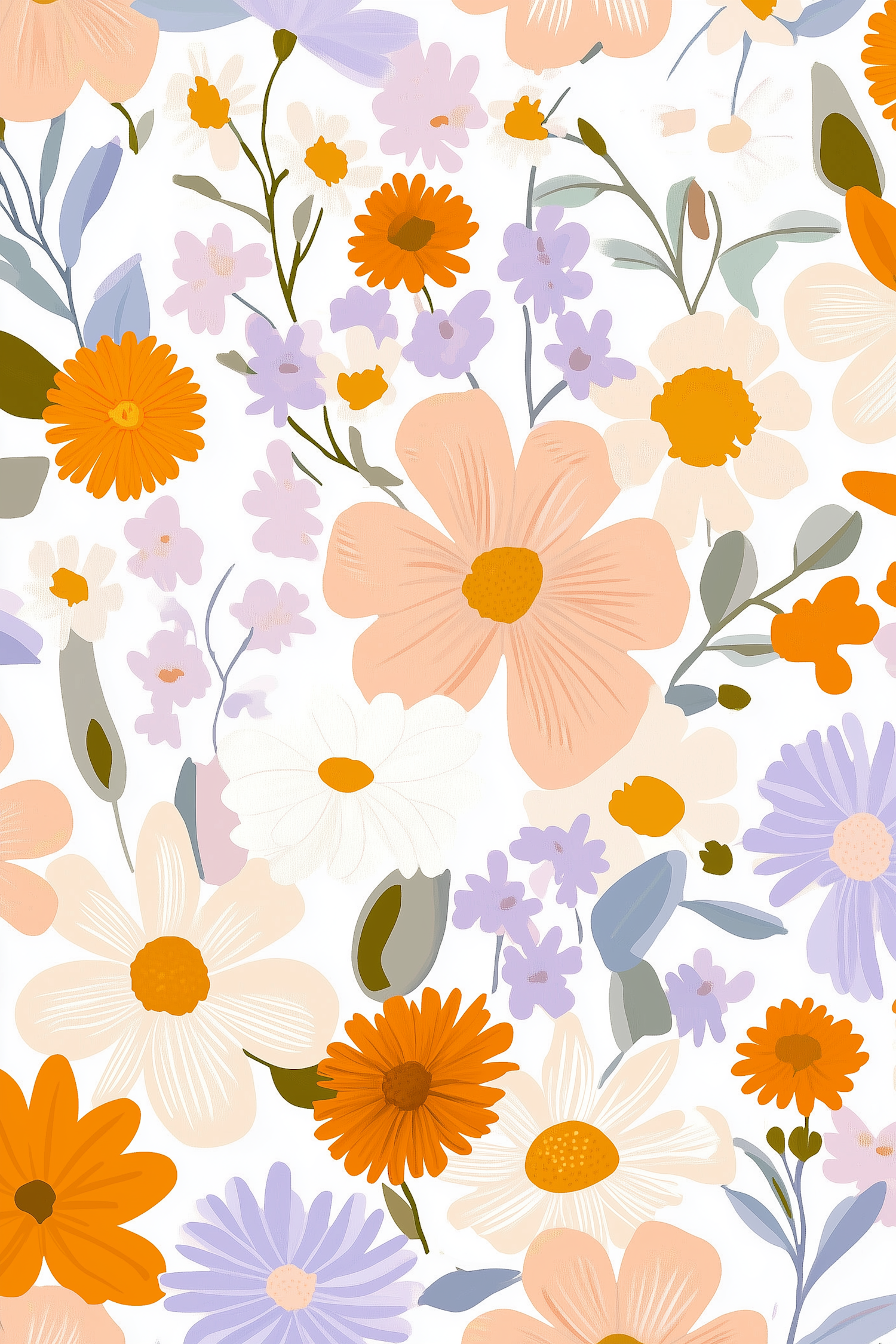 Colorful floral illustration with peach, orange, and lavender flowers on a white background, creating a lively and harmonious pattern.