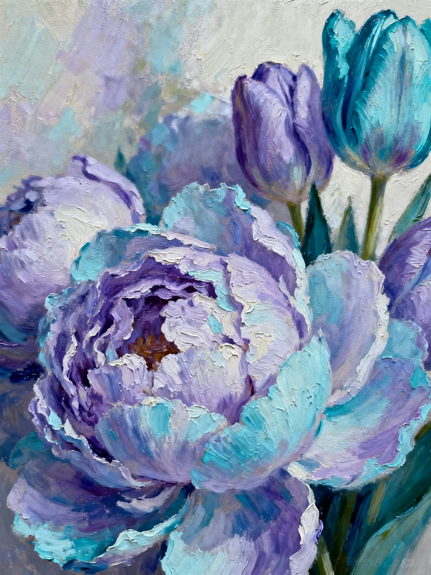 textured floral oil painting, close-up composition, soft brush strokes, abstract yet detailed petals, aesthetic and bold visual style, natural light color blending, modern fine art photography look, painted texture visible, artistic and dreamy mood. a composition of peony and tulip petals in shades of lavender mist and ocean sapphire, delicate transitions between purple and blue tones, modern and poetic atmosphere