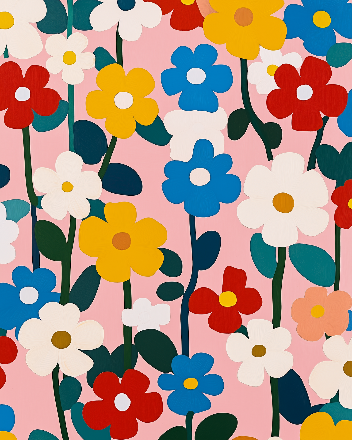 Colorful floral illustration with bold red, yellow, blue, and white flowers on a pink background. Modern, playful design.