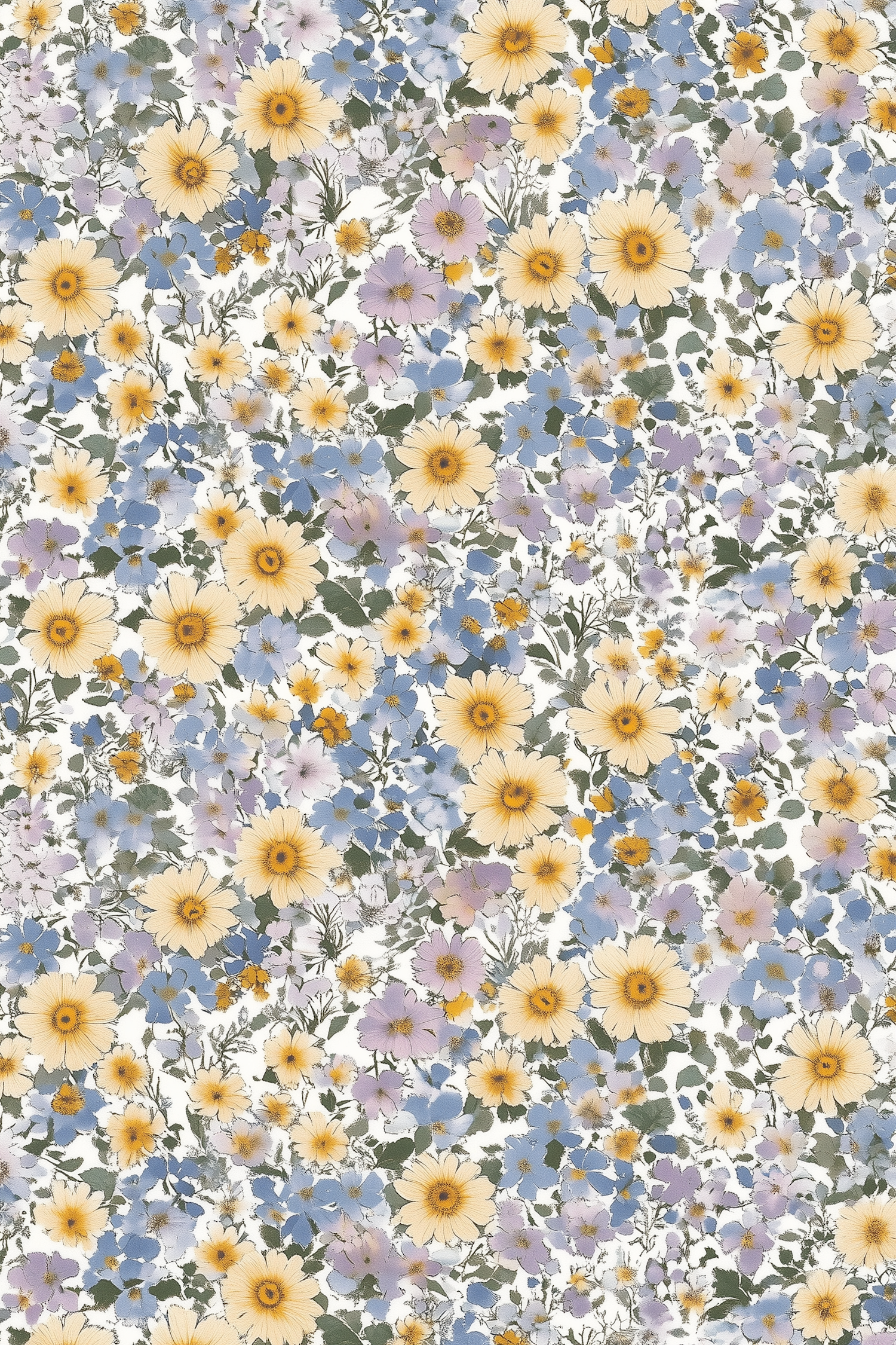Vibrant floral pattern with yellow, blue, and purple flowers on an off-white background, creating a lush garden tapestry.