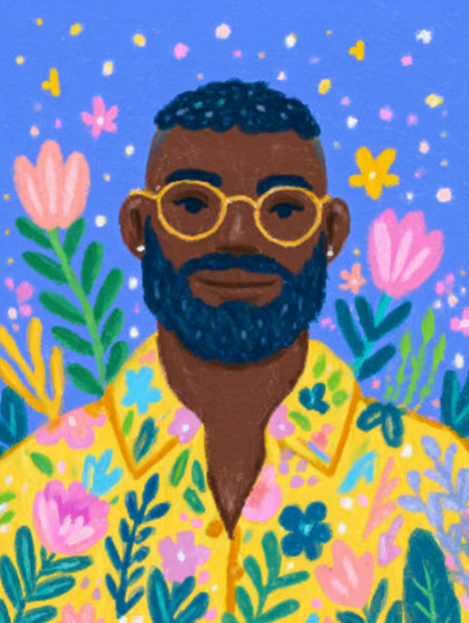 Colorful illustration of a person with glasses and a floral shirt, surrounded by a vibrant floral background.