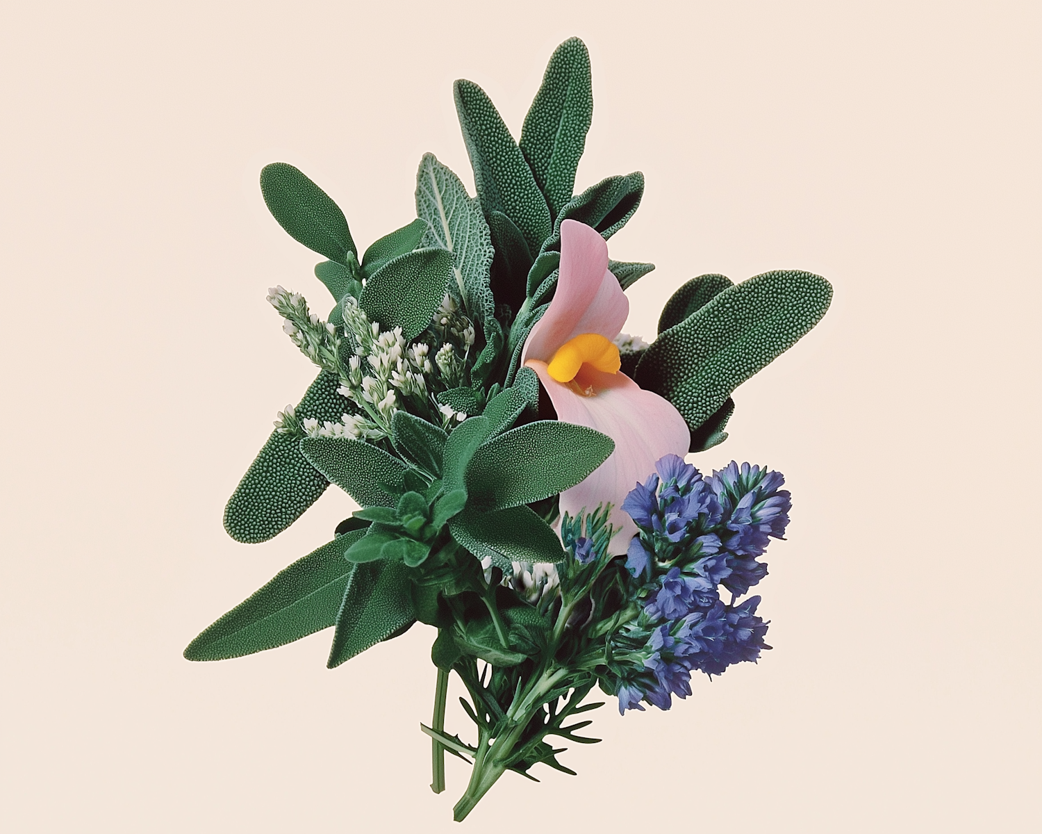 A vibrant bouquet with green leaves, pink and yellow flowers, and blue blossoms against a light background.