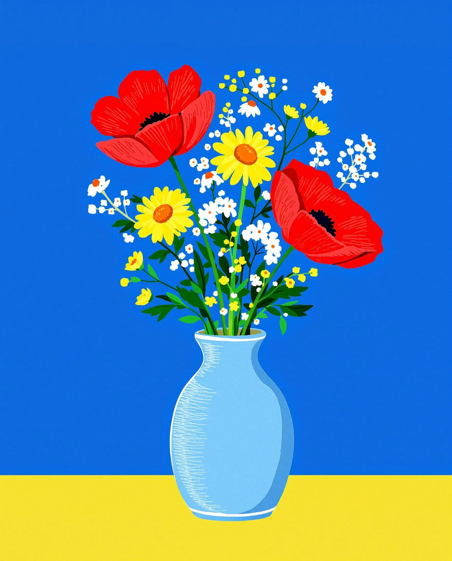 Bright and graphic illustration of a ceramic vase filled with stylized flowers: large red poppies, small yellow daisies, and delicate white wildflowers. The vase sits alone on a flat, bright blue background. Flowers are rendered with clean, rounded shapes and vivid blocks of color. Bold yet elegant composition. No text.
