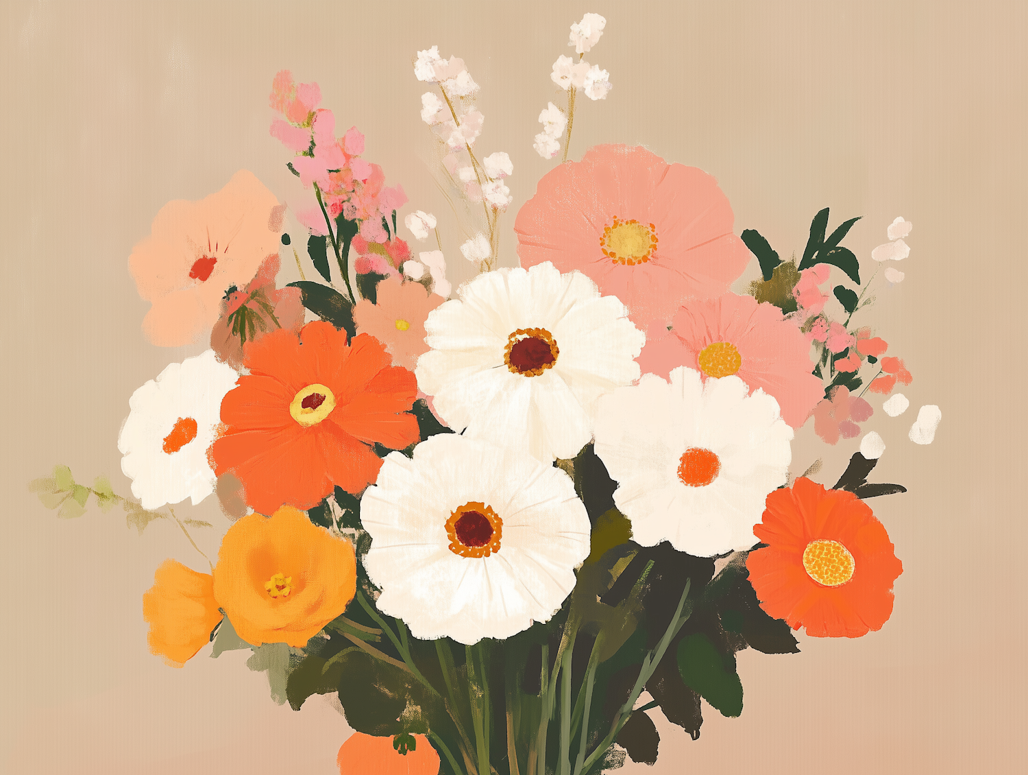 Vibrant floral illustration with white, orange, and pink flowers against a beige background, showcasing intricate details and vivid colors.