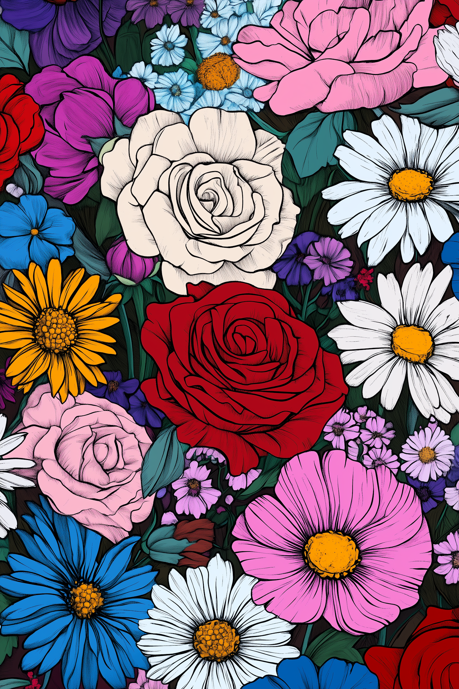 Vibrant floral illustration with roses, daisies, and colorful blooms in red, pink, white, and blue hues.