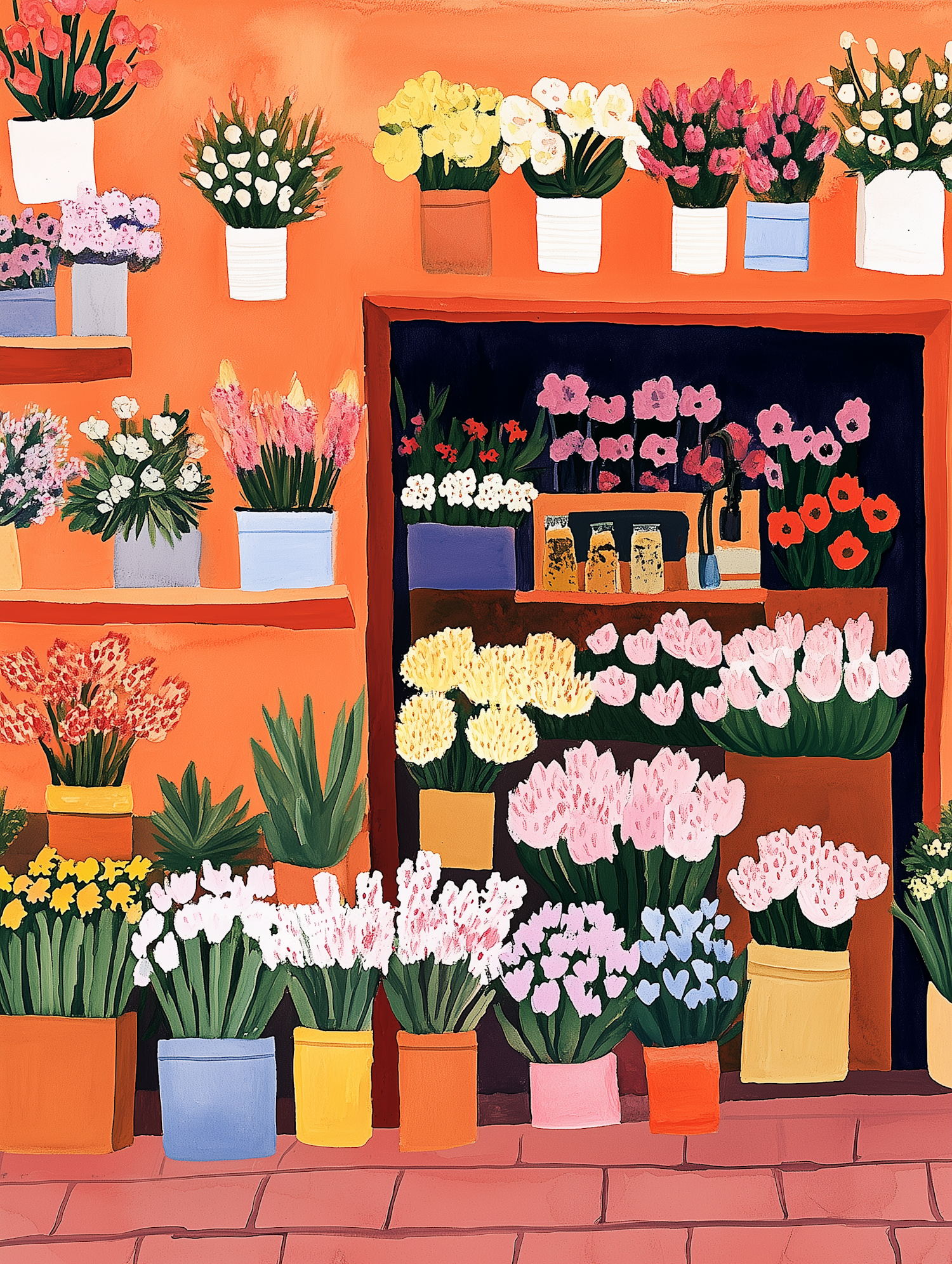 Colorful flower shop illustration with vibrant blooms in pots against a warm orange background, creating a lively and inviting scene.
