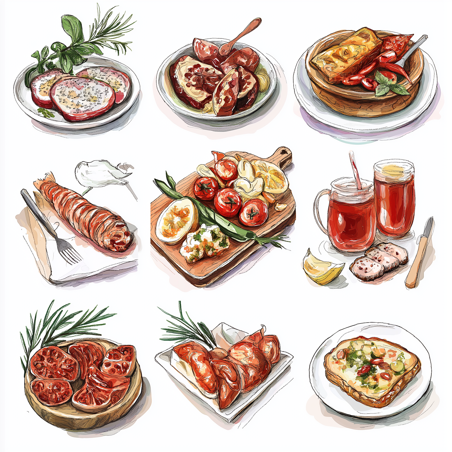 A colorful grid of illustrated dishes, from pomegranate bowls to cheesy toast, perfect for food lovers and culinary inspiration.