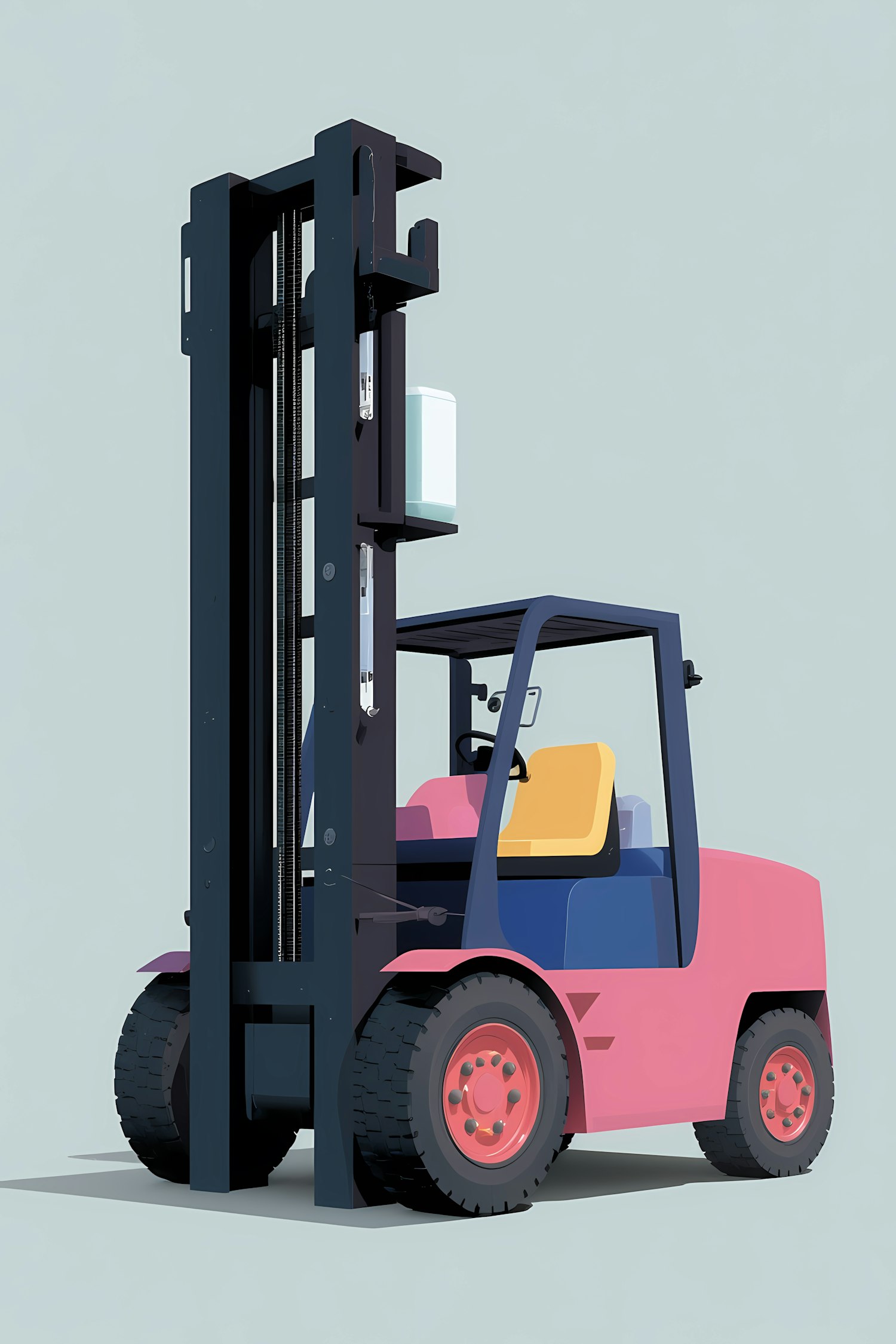 A colorful illustration of a forklift with a pink body, yellow seat, and blue accents, set against a plain light gray background.