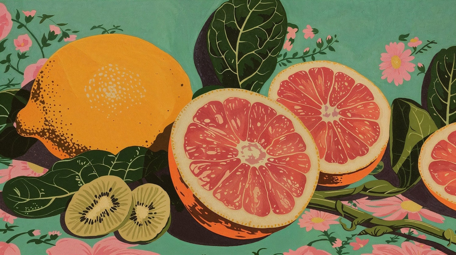 Colorful illustration of grapefruit, lemon, and kiwi with green leaves and pink flowers on a teal background.