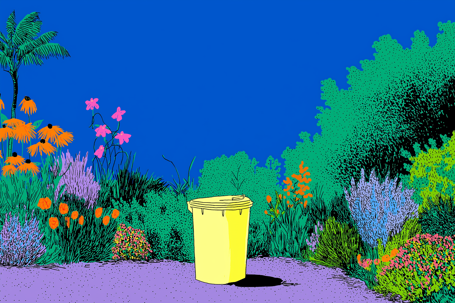 A colorful illustration of a garden with a yellow trash bin, vibrant flowers, and a deep blue sky, showcasing a bold and stylized art style.