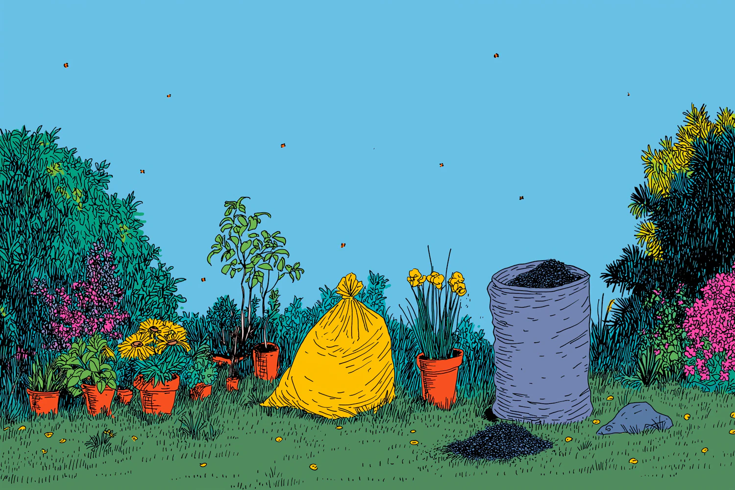 A colorful garden illustration with potted plants, a yellow bag, and a gray sack on a grassy lawn under a clear blue sky.