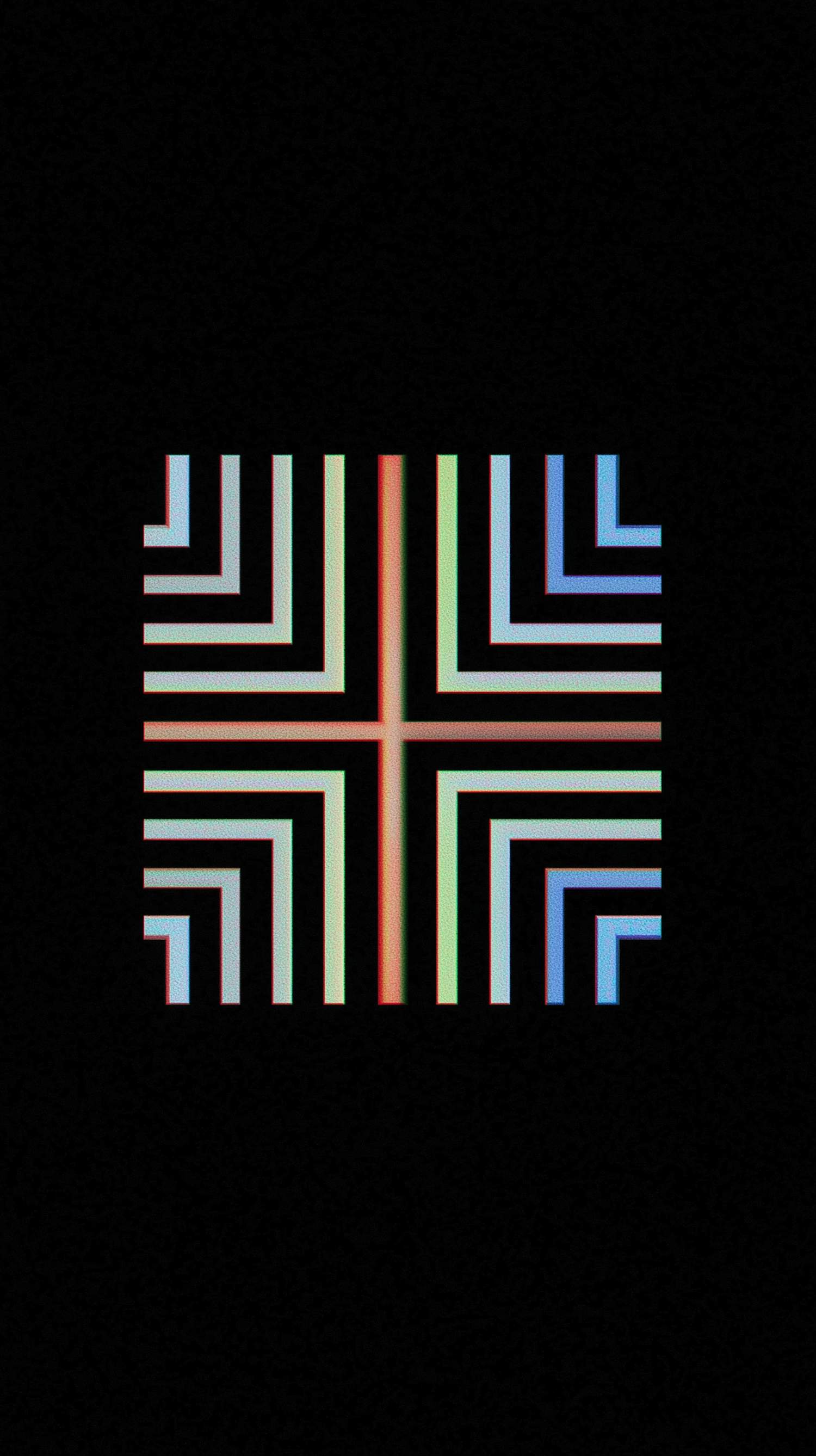 Vibrant geometric design with multicolored lines forming a cross on a black background, creating a neon-like, symmetrical pattern.