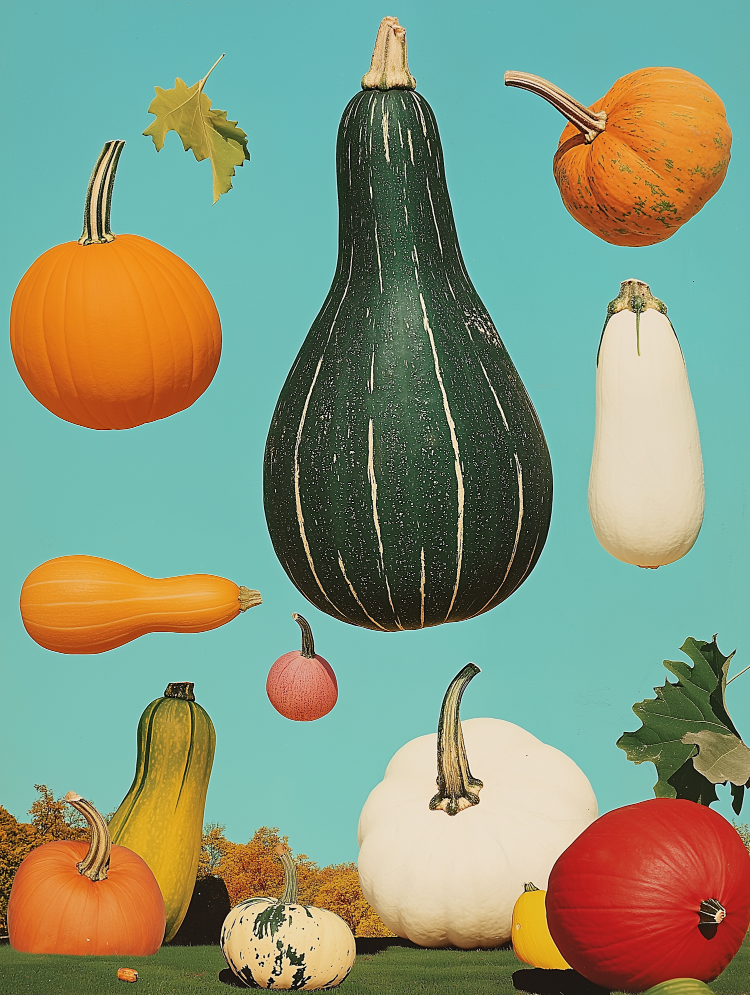 Surreal floating pumpkins and squash against a turquoise sky, creating a whimsical autumn scene with vibrant colors and playful composition.