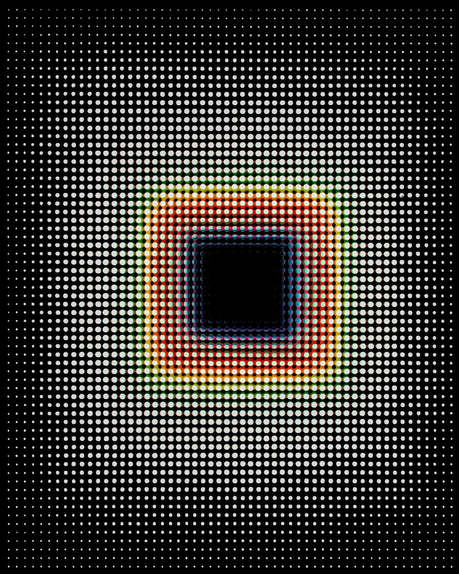 Abstract digital art with a colorful gradient square surrounded by white dots on a black background, creating a glowing, modern effect.