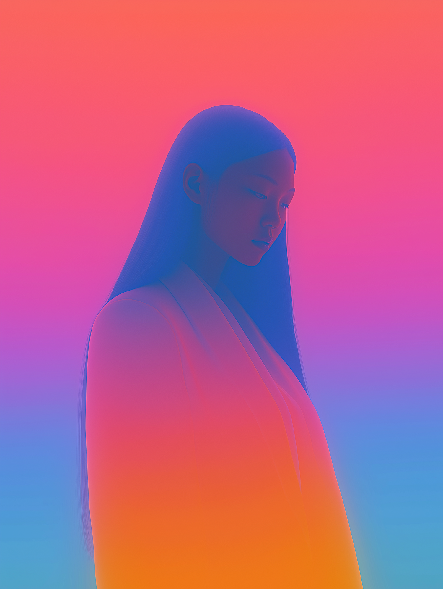 A vibrant gradient portrait of a serene individual in profile, blending pink, orange, and blue hues in a minimalist, abstract style.