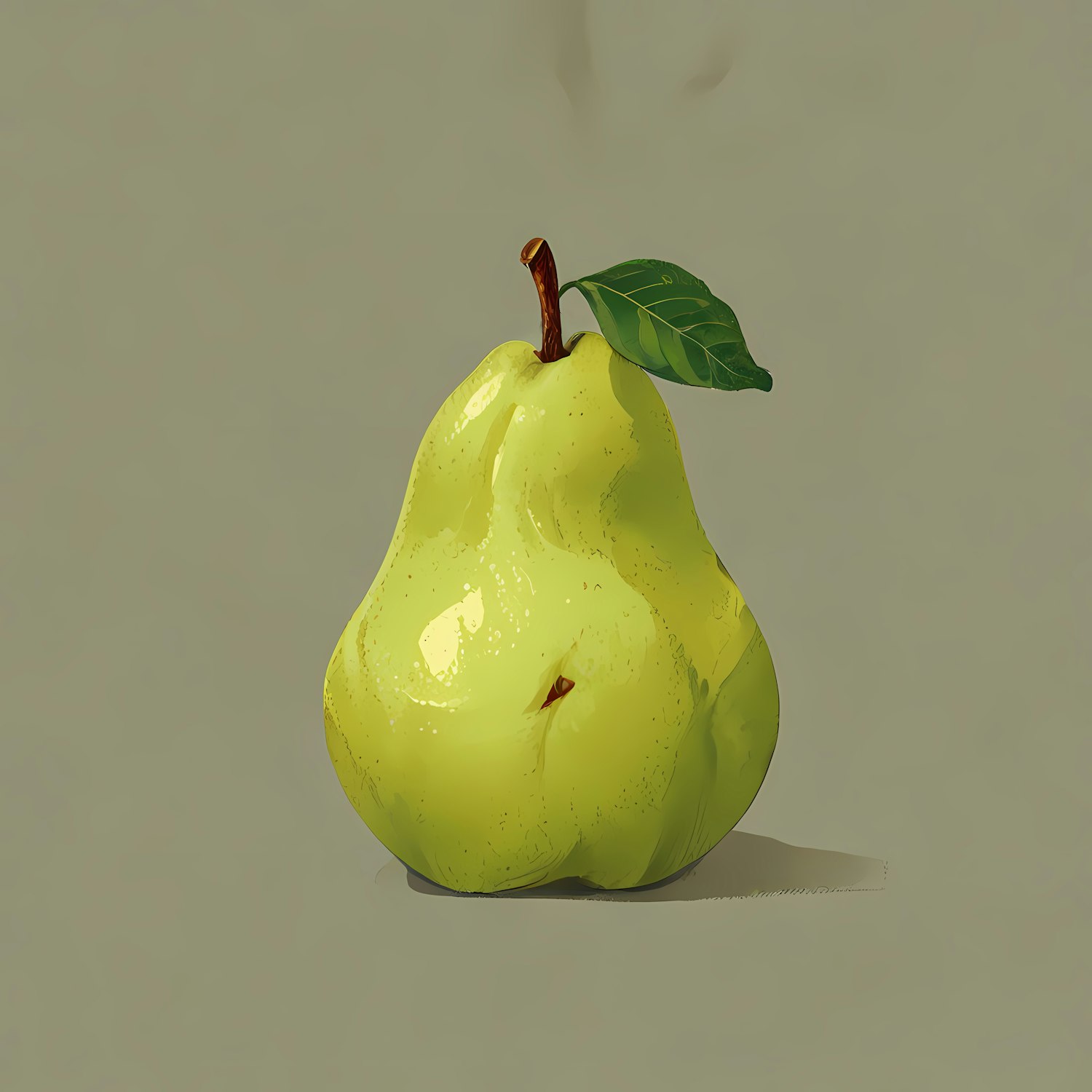 Illustration of a vibrant yellow-green pear with a glossy surface and a single leaf, set against a muted gray background.