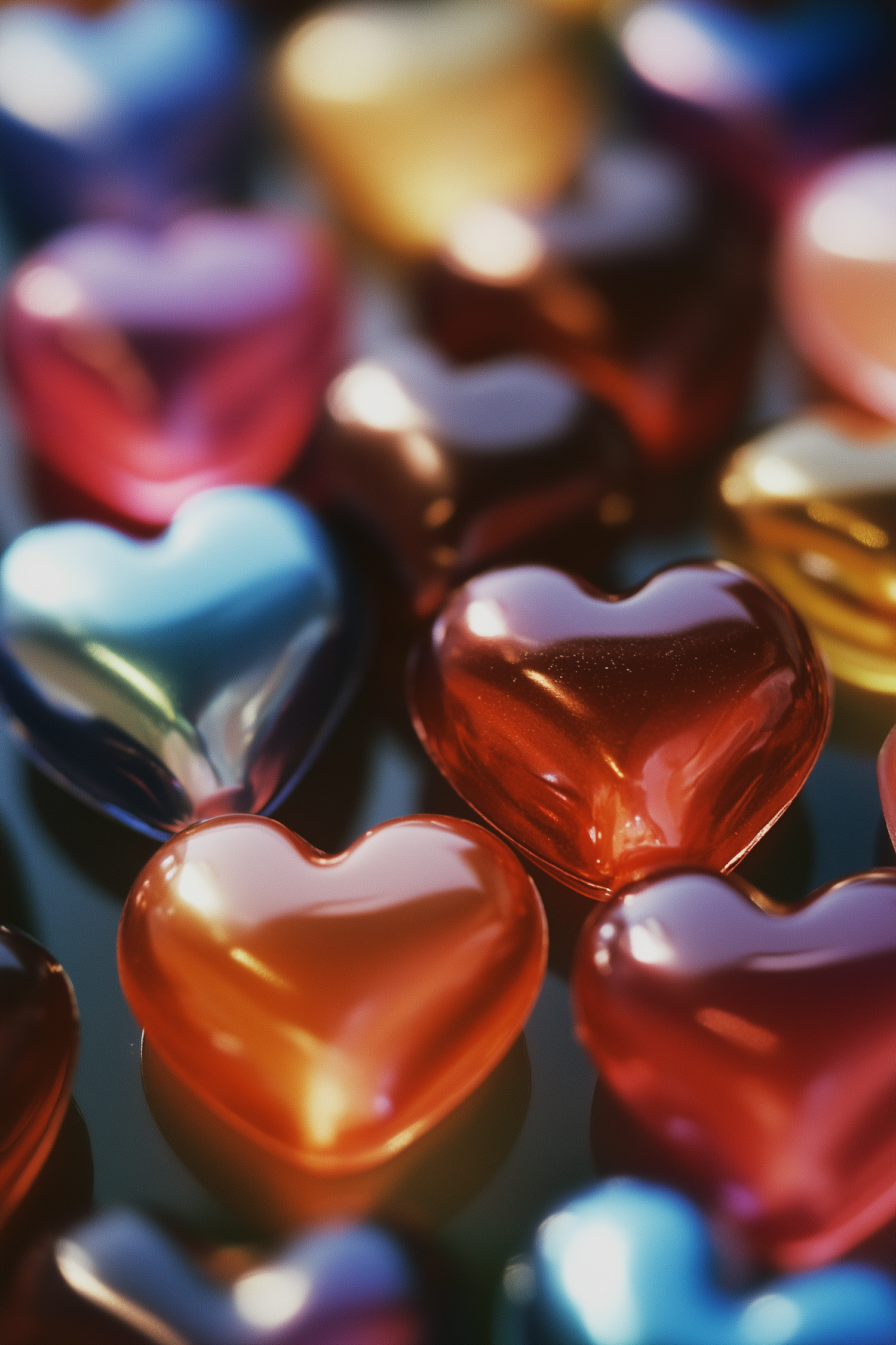 Vibrant glossy heart-shaped objects in various colors, creating a visually appealing pattern with reflective surfaces.