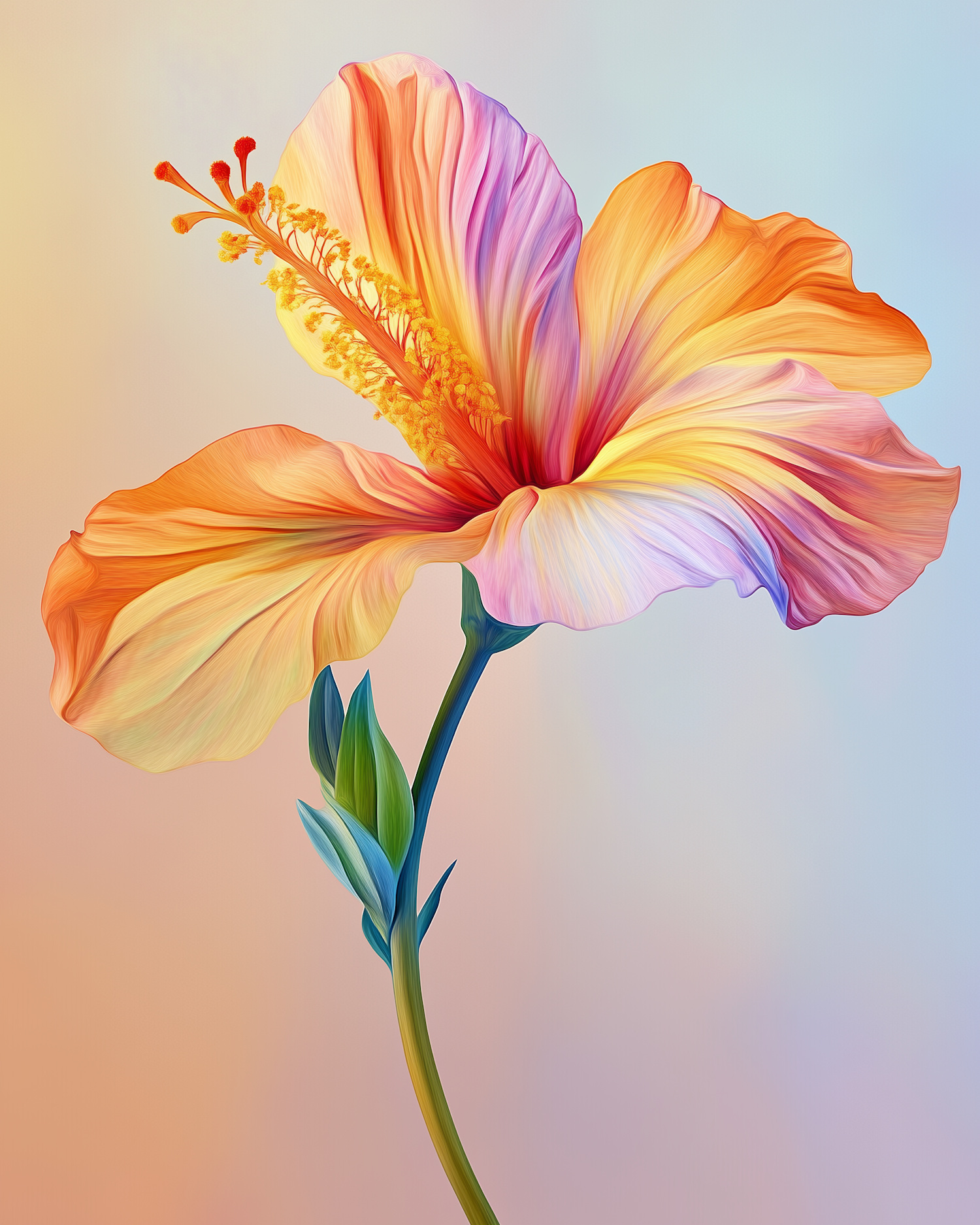 Vibrant illustration of a hibiscus flower with orange, pink, and yellow petals against a gradient background.