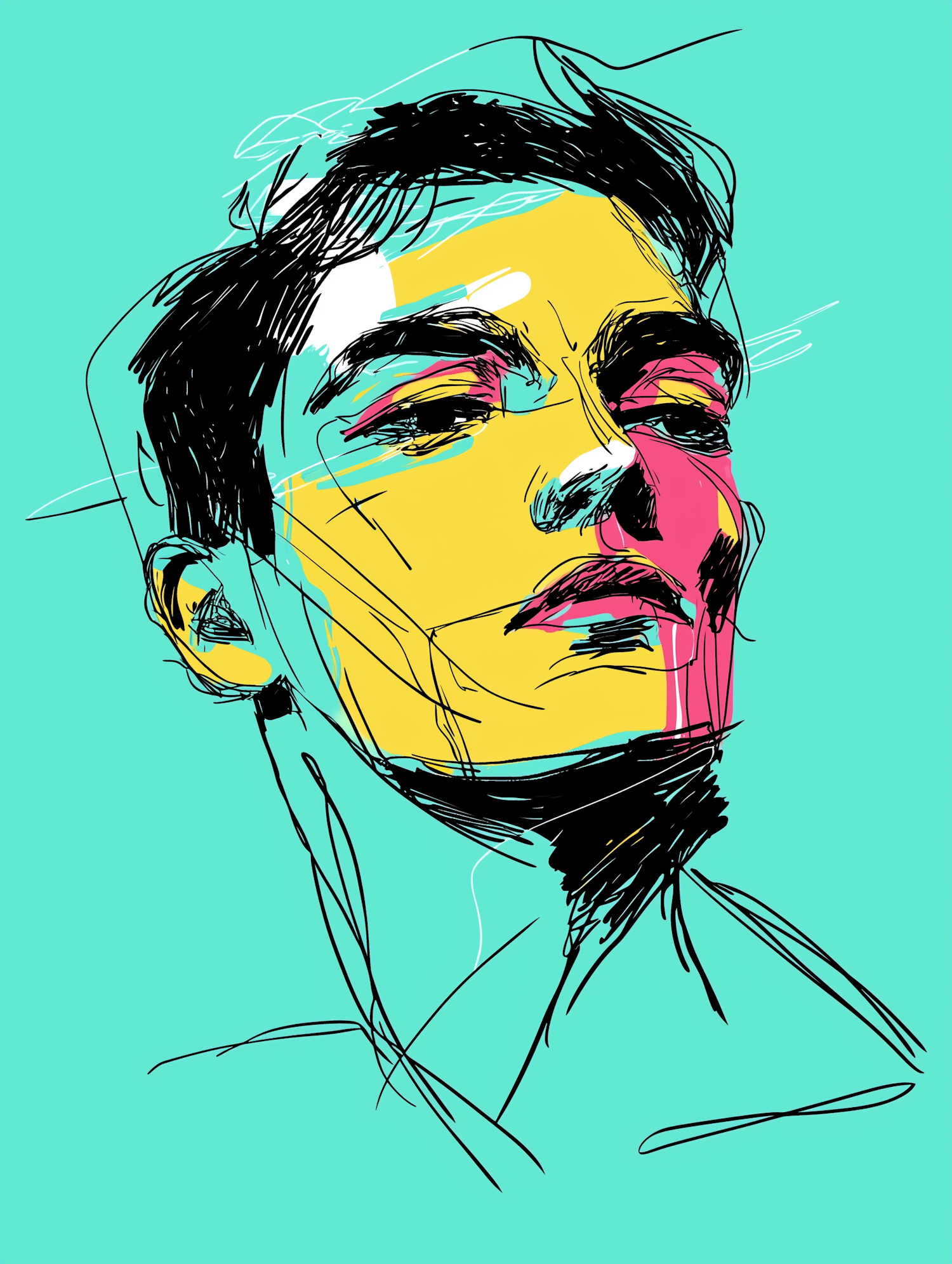 Abstract portrait illustration with bold lines and vibrant colors on a turquoise background, featuring expressive facial details.
