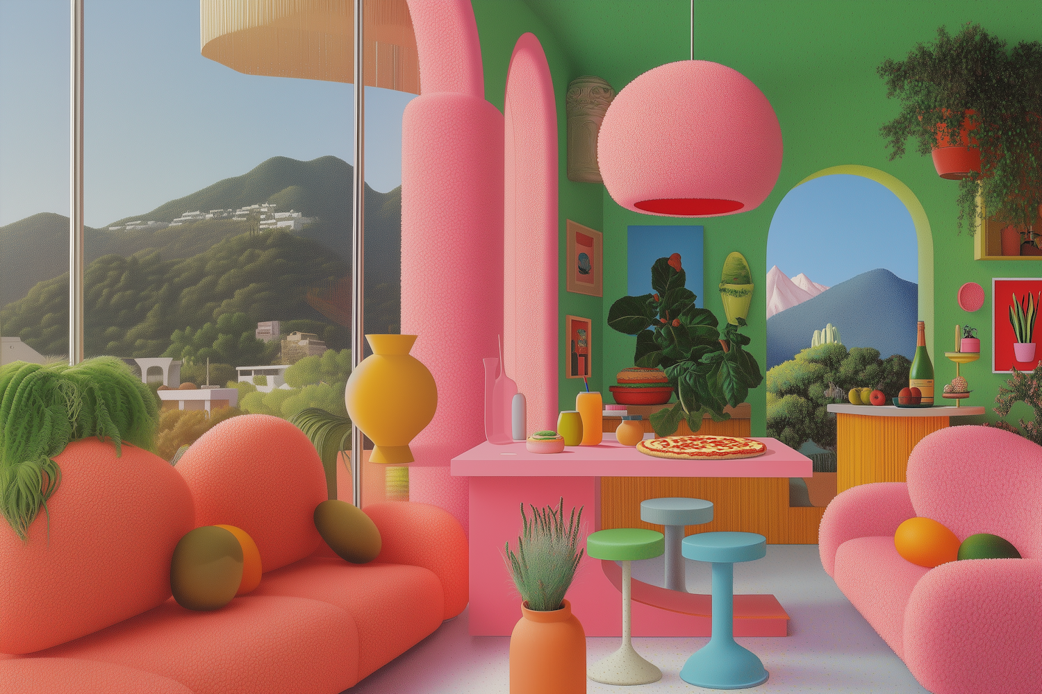Vibrant interior with bold colors, eclectic decor, and a scenic view of green hills. Features pink sofa, colorful stools, and playful design.