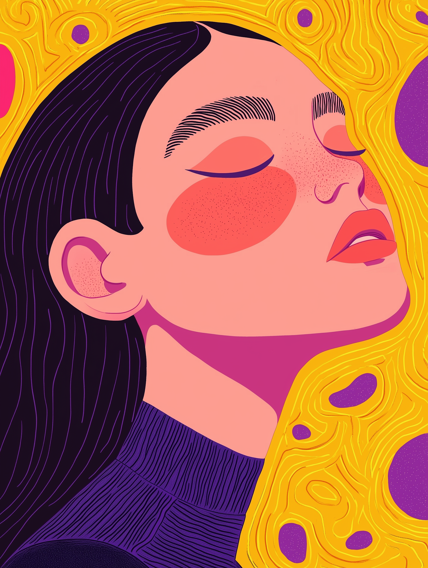 Vibrant illustration of a serene woman with closed eyes, pink skin, and bold colors against a dynamic yellow and purple background.