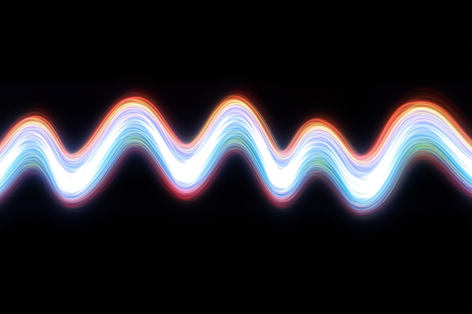 A glowing multicolored wave of light on a black background, blending vibrant hues like white, blue, red, and yellow in an abstract design.
