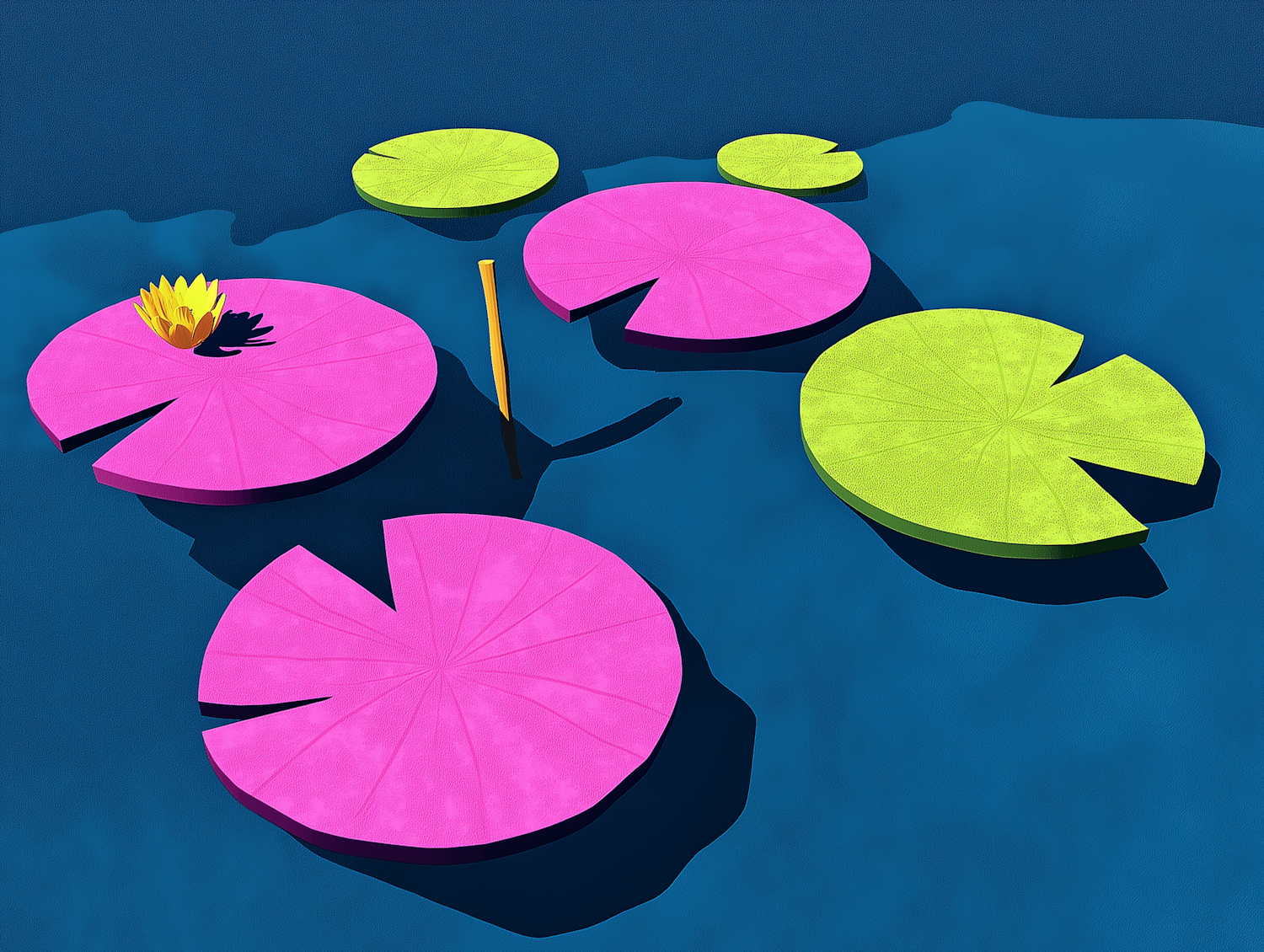 Vibrant pink and green lily pads with a yellow flower on blue water, creating a striking contrast and serene scene.