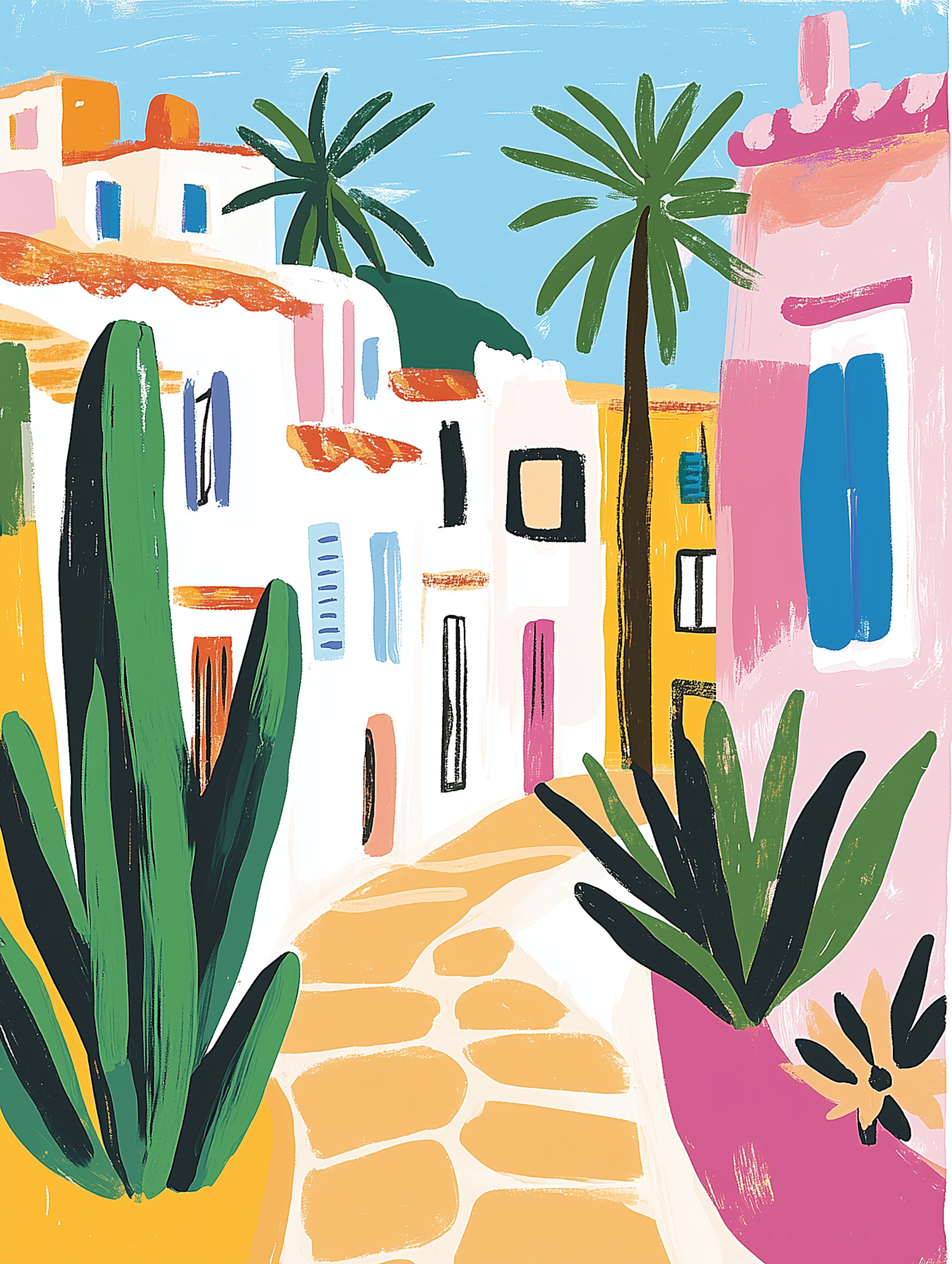 Colorful Mediterranean street scene with vibrant buildings, palm trees, and cacti under a bright blue sky.