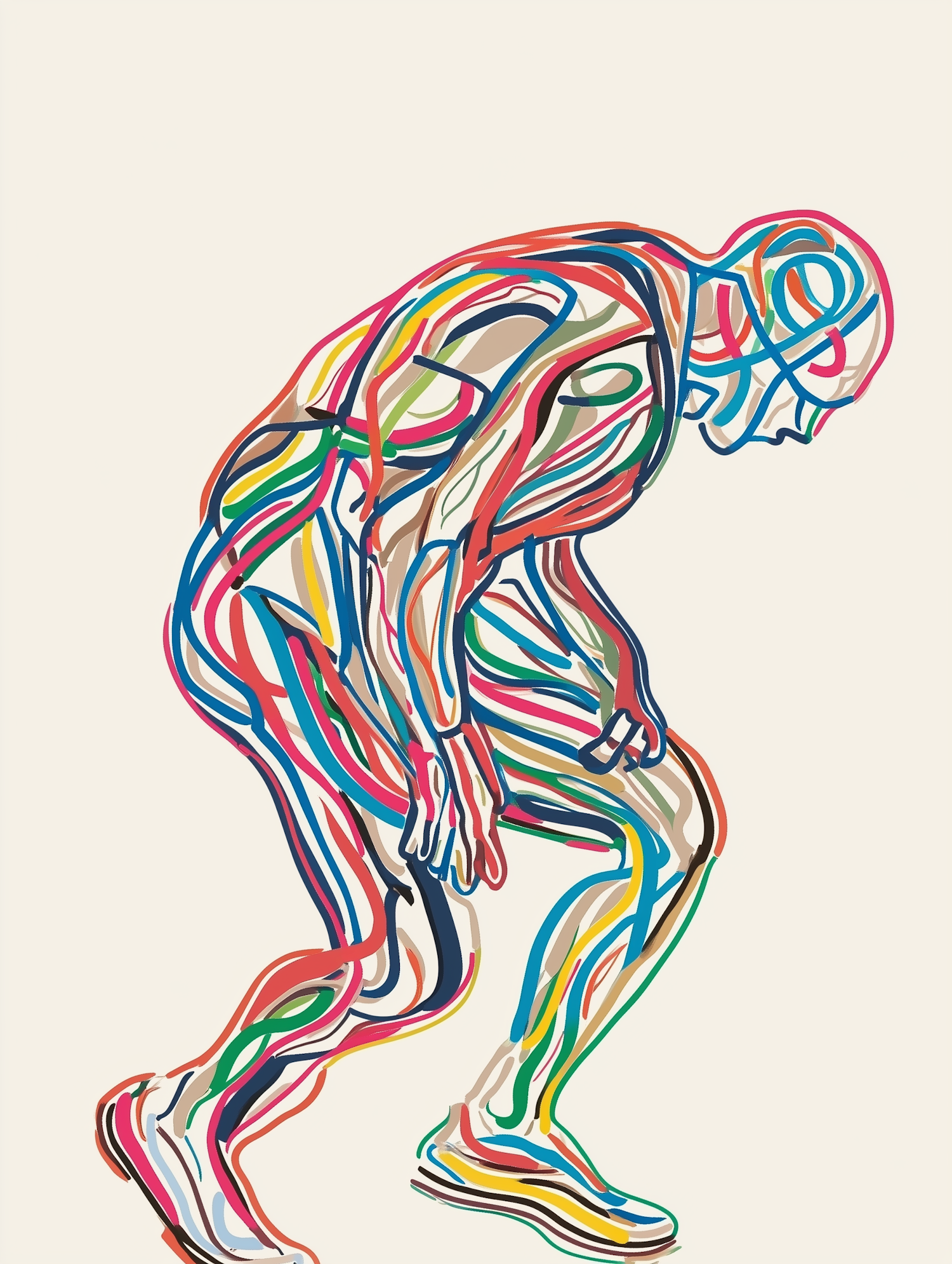 Abstract illustration of a human figure in colorful lines, bent forward, on a light background. Vibrant and dynamic design.